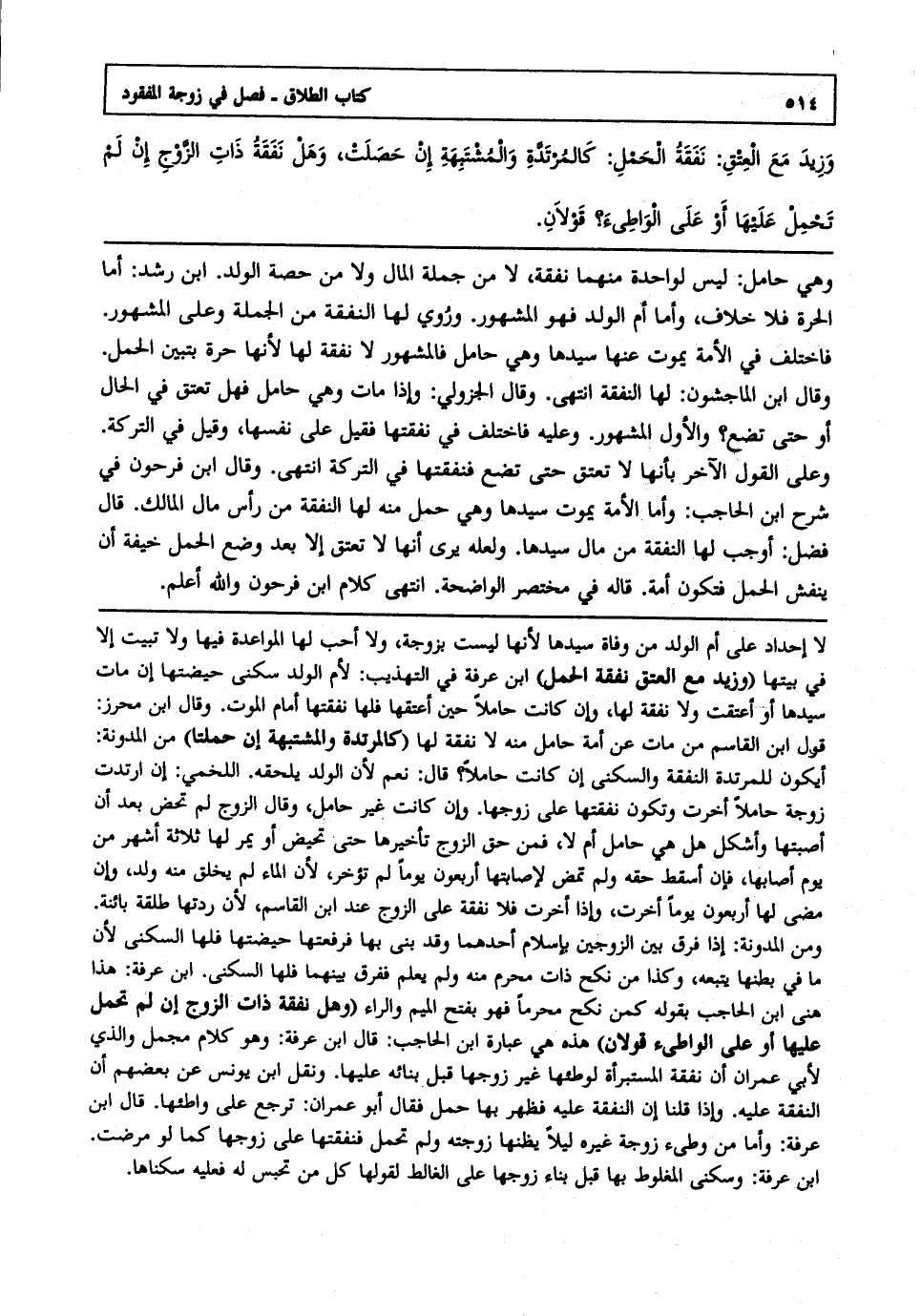 وهي حامل: ليس لواحدة منهما نفقة لا من جملة المال ولا من حصة الولد ابن رشد: أما الحرة فلا خلاف وأما أم الولد فهو المشهور وروي لها النفقة من الجملة وعلى المشهور فاختلف في الأمة يموت عنها سيدها وهي حامل فالمشهور لا نفقة لها لأنها حرة بتبين الحمل وقال ابن الماجشون: لها النفقة انتهى. وقال الجزولي: وإذا مات وهي حامل فهل تعتق في الحال أو حتى تضع؟ والأول المشهور وعليه فاختلف في نفقتها فقيل على نفسها وقيل في التركة وعلى القول الآخر بأنها لا تعتق حتى تضع فنفقتها في التركة انتهى. وقال ابن فرحون في شرح ابن الحاجب: وأما الأمة يموت سيدها وهي حمل منه لها النفقة من رأس مال المالك قال فضل أوجب لها النفقة من مال سيدها ولعله يرى أنها لا تعتق إلا بعد وضع الحمل خيفة أن ينفش الحمل فتكون أمة قاله في مختصر الواضحة انتهى. كلام ابن فرحون والله أعلم.