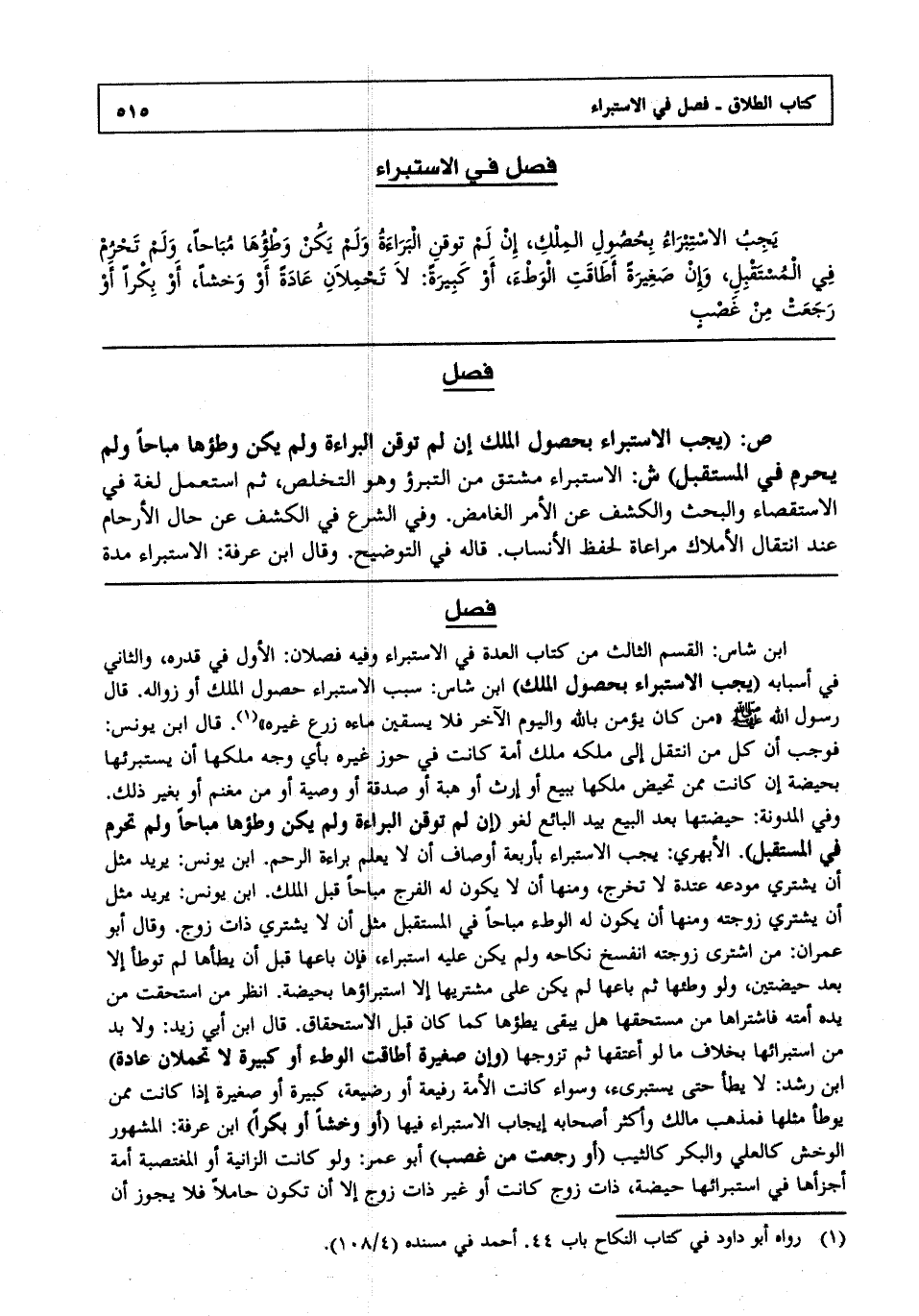 ص: "يجب الاستبراء بحصول الملك إن لم توقن البراءة ولم يكن وطؤها مباحا ولم يحرم في المستقبل" ش: الاستبراء مشتق من التبرؤ وهو التخلص ثم استعمل لغة في الاستقصاء والبحث والكشف عن الأمر الغامض وفي الشرع في الكشف عن حال الأرحام عند انتقال الأملاك مراعاة لحفظ الأنساب. قاله في التوضيح. وقال ابن عرفة الاستبراء مدة