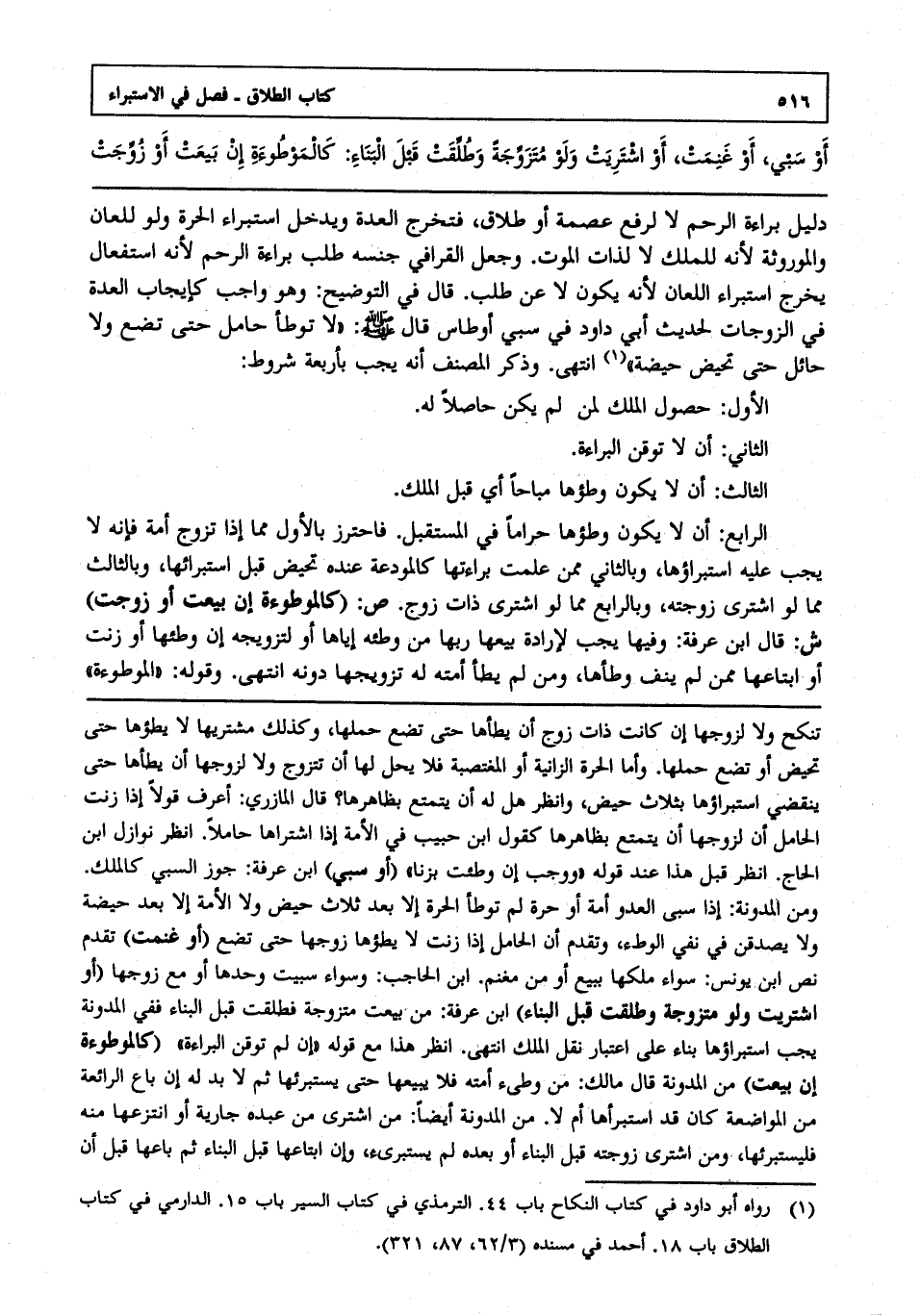 دليل براءة الرحم لا لرفع عصمة أو طلاق فتخرج العدة ويدخل استبراء الحرة ولو للعان والموروثة لأنه للملك لا لذات الموت وجعل القرافي جنسه طلب براءة الرحم لأنه استفعال يخرج استبراء اللعان لأنه يكون لا عن طلب قال في التوضيح: وهو واجب كإيجاب العدة في الزوجات لحديث أبي داود في سبي أوطاس قال صلى الله عليه وسلم: "لا توطأ حامل حتى تضع ولا حائل حتى تحيض حيضة" 1 انتهى. وذكر المصنف أنه يجب بأربعة شروط: الأول: حصول الملك لمن لم يكن حاصلا له.