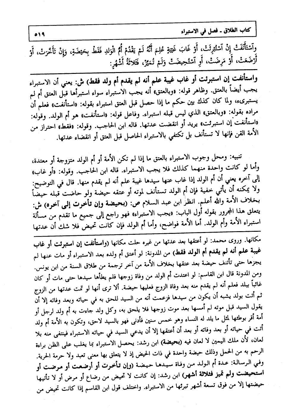 واستأنفت إن استبرئت أو غاب غيبة علم أنه لم يقدم أم ولد فقط" ش: يعني أن الاستبراء يجب أيضا بالعتق وظاهر قوله: "وبالعتق" أنه يجب الاستبراء سواء استبرأها قبل العتق أم لم يستبرئ ولما كان كذاك بين حكم ما إذا حصل قبل العتق استبراء بقوله: "استأنفت" فعلم أن مراده بقوله: "وبالعتق" الذي ليس قبله استبراء وفاعل قوله: "استأنفت" هو أم الولد وقوله: "استأنفت إن استبرئت" يريد أو انقضت عدتها قاله ابن الحاجب وقوله: "فقط" احتراز من الأمة القن فإنها لا تستأنف بل تكتفي بالاستبراء الحاصل قبل العتق أو انقضاء عدتها.