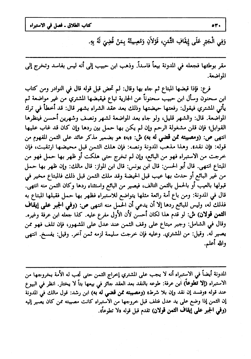 فرع: فإذا قبضها المبتاع ثم جاء بها وقال لم تحض قبل قوله قال في النوادر ومن كتاب ابن سحنون وسأل ابن حبيب سحنونا عن الجارية تباع فيقبضها المشتري من غير مواضعة ثم يأتي المشتري فيقول رفعتها حيضتها وذلك بعد عقد الشراء بشهر قال قد أخطأ في ترك المواضعة قال والشهر قليل ولو جاء بعد المواضعة لشهر ونصف وشهرين أحسن فينظرها القوابل فإن قلن مشغولة الرحم وإن لم يكن بها حمل بين ردها وإن كان قد غاب عليها انتهى. ص: "ومصيبته ممن قضي له به" ش: "به" هو بضمير مذكر عائد على الثمن المفهوم من قوله: "إن نقد" وهذا مذهب المدونة: ونصه فإن هلك الثمن قبل محيضها ارتقبت فإن خرجت من الاستبراء فهو من البائع وإن لم تخرج حتى هلكت أو ظهر بها حمل فهو من المبتاع انتهى. قال أبو الحسن: قال ابن يونس: قال ابن المواز: قال مالك: وإن ظهر بها حمل من غير البائع أو حدث بها عيب قبل الحيضة وقد ملك الثمن قبل ذلك فالمبتاع مخير في قبولها بالعيب أو بالحمل بالثمن التالف فيصير من البائع واستثناء ردها وكان الثمن منه انتهى. قال في المدونة: ومن باع أمة رائعة مثلها يتواضع للاستبراء فظهر بها حمل فقبلها المبتاع به فذلك له وليس للبائع ردها إلا أن يدعي أن الحمل منه انتهى. ص: "وفي الجبر على إيقاف الثمن قولان" ش: لو قدم هذا لكان أحسن لأن الأول مفرع عليه كذا جعله ابن عرفة وغيره وقال في الشامل: وجبر مبتاع على وقف الثمن عند عدل على المشهور فإن تلف فهو ممن يصير له وقيل: من المشتري وعليه فإن خرجت سليمة لزمه ثمن آخر وقيل: يفسخ انتهى. والله أعلم.