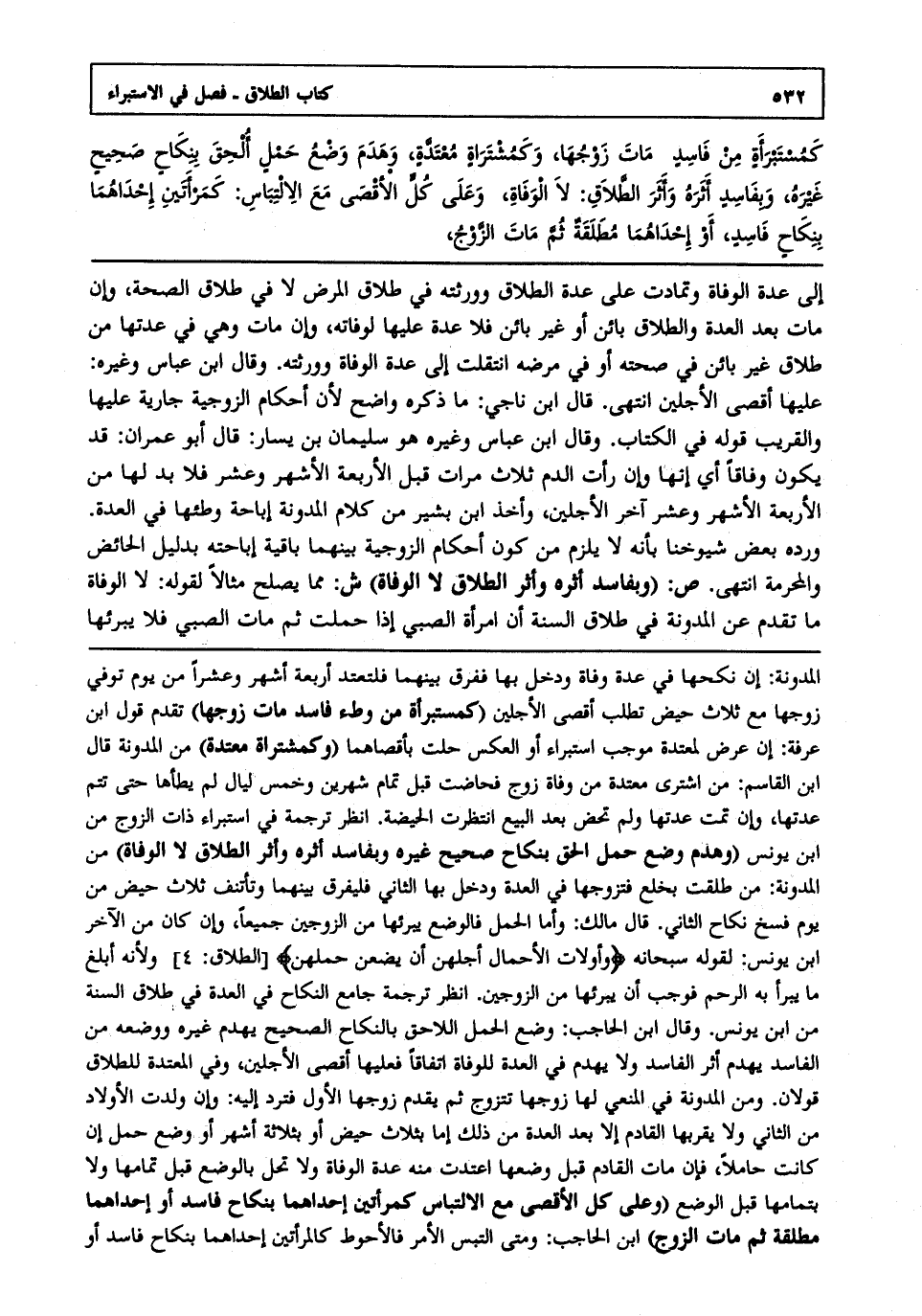 إلى عدة الوفاة وتمادت على عدة الطلاق وورثته في طلاق المرض لا في طلاق الصحة وإن مات بعد العدة والطلاق بائن أو غير بائن فلا عدة عليها لوفاته وإن مات وهي في عدتها من طلاق غير بائن في صحته أو في مرضه انتقلت إلى عدة الوفاة وورثته وقال ابن عباس وغيره: عليها أقصى الأجلين انتهى. قال ابن ناجي: ما ذكره واضح لأن أحكام الزوجية جارية عليها والقريب قوله في الكتاب وقال ابن عباس وغيره هو سليمان بن يسار قال أبو عمران: قد يكون وفاقا أي إنها وإن رأت الدم ثلاث مرات قبل الأربعة الأشهر وعشر فلا بد لها من الأربعة الأشهر وعشر آخر الأجلين وأخذ ابن بشير من كلام المدونة: إباحة وطئها في العدة ورده بعض شيوخنا بأنه لا يلزم من كون أحكام الزوجية بينهما باقية إباحته بدليل الحائض والمحرمة انتهى. ص: "وبفاسد أثره وأثر الطلاق لا الوفاة" ش: مما يصلح مثالا لقوله: لا الوفاة ما تقدم عن المدونة: في طلاق السنة أن امرأة الصبي إذا حملت ثم مات الصبي فلا يبرئها
