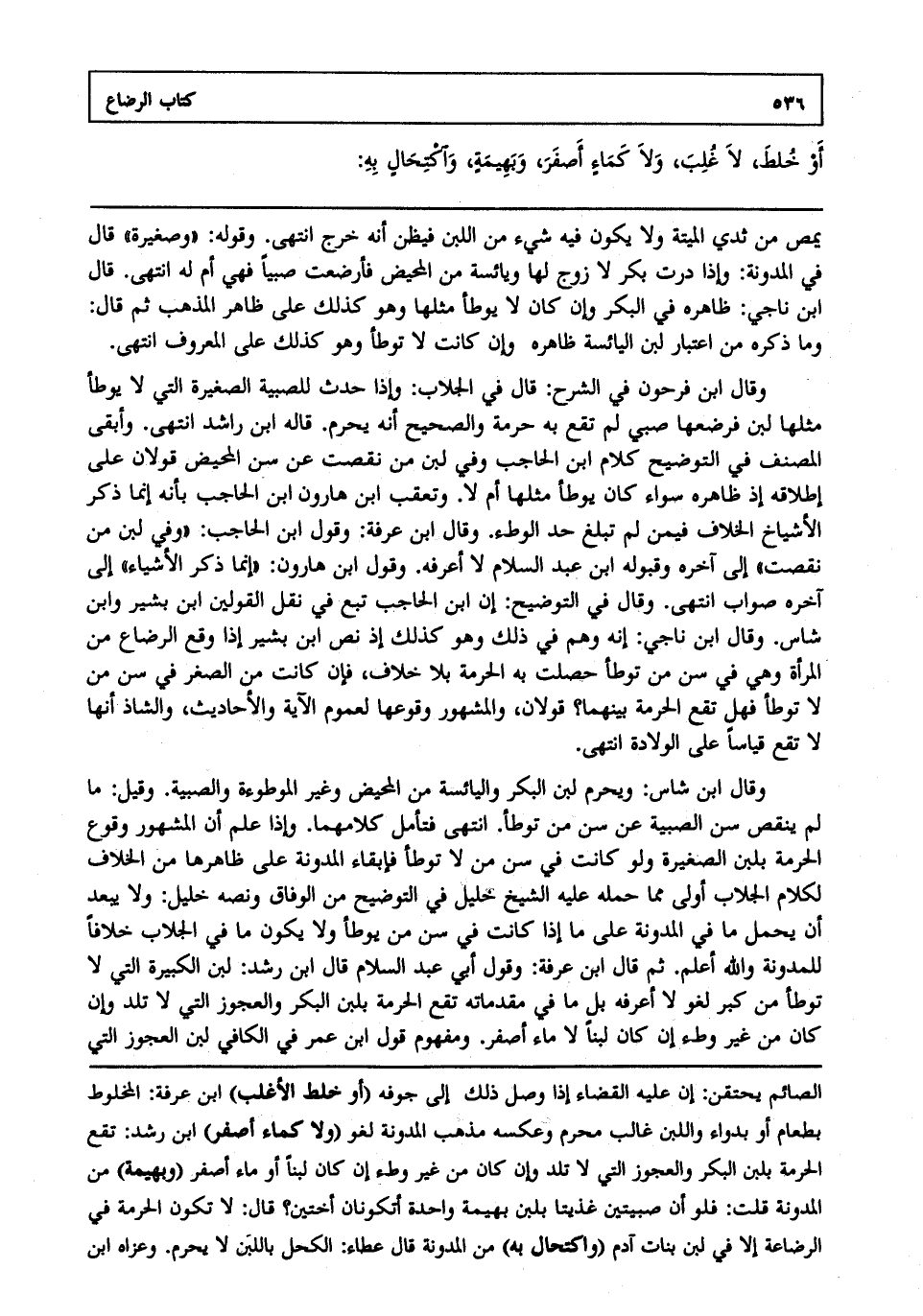 وقال ابن فرحون في الشرح: قال في الجلاب وإذا حدث للصبية الصغيرة التي لا يوطأ مثلها لبن فرضعها صبي لم تقع به حرمة والصحيح أنه يحرمقاله ابن راشد انتهى. وأبقى المصنف في التوضيح كلام ابن الحاجب: وفي لبن من نقصت عن سن المحيض قولان على إطلاقه إذ ظاهره سواء كان يوطأ مثلها أم لا وتعقب ابن هارون ابن الحاجب بأنه إنما ذكر الأشياخ الخلاف فيمن لم تبلغ حد الوطء وقال ابن عرفة وقول ابن الحاجب: "وفي لبن من نقصت" إلى آخره وقبوله ابن عبد السلام لا أعرفه وقول ابن هارون: "إنما ذكر الأشياء" إلى آخره صواب انتهى. وقال في التوضيح إن ابن الحاجب تبع في نقل القولين ابن بشير وابن شاس وقال ابن ناجي إنه وهم في ذلك وهو كذلك إذ نص ابن بشير إذا وقع الرضاع من المرأة وهي في سن من توطأ حصلت به الحرمة بلا خلاف فإن كانت من الصغر في سن من لا توطأ فهل تقع الحرمة بينهما قولان والمشهور وقوعها لعموم الآية والأحاديث والشاذ أنها لا تقع قياسا على الولادة انتهى.