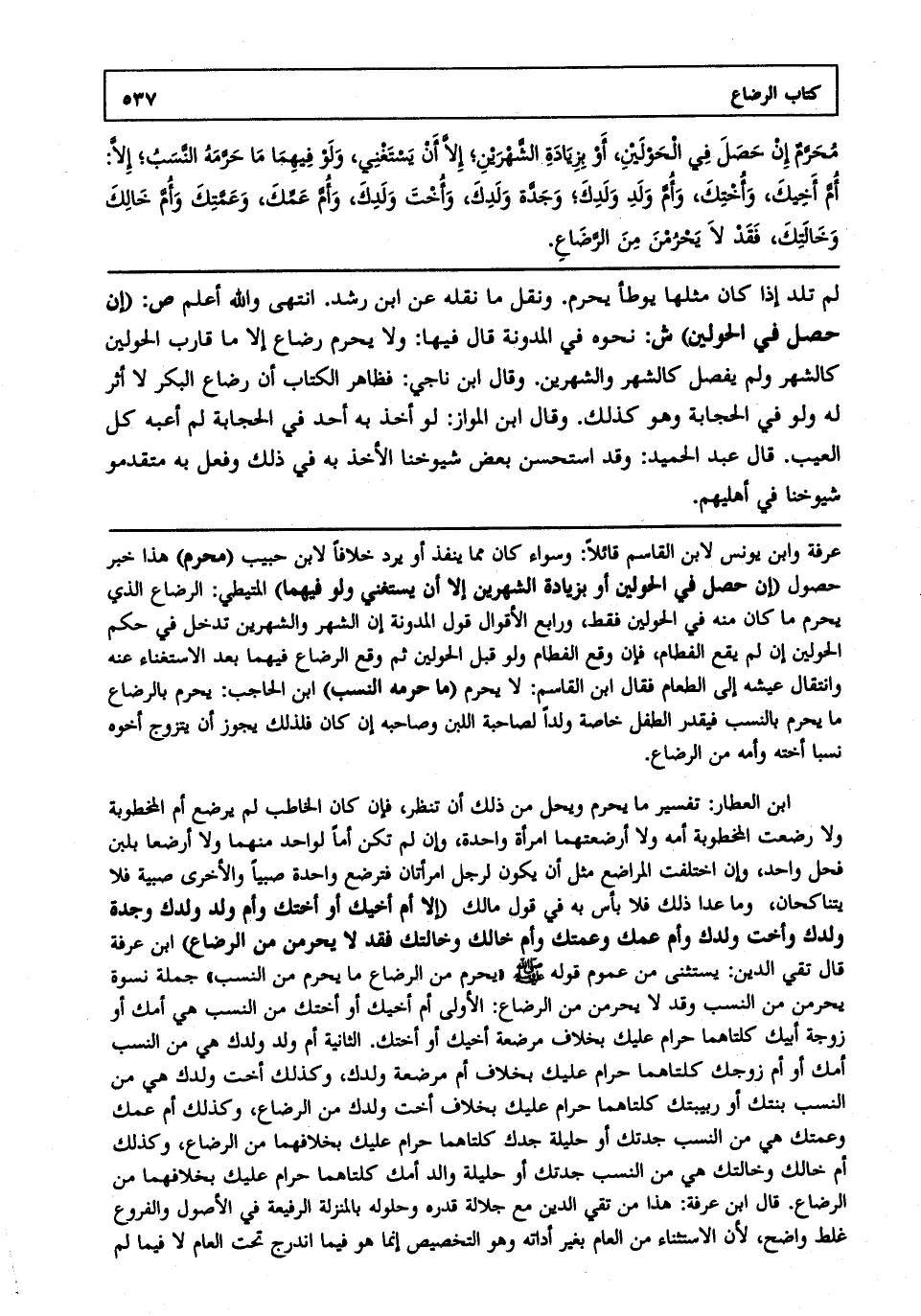 محرم إن حصل في الحولين أو بزيادة الشهرين إلا أن يستغني، ولو فيهما ما حرمه النسب إلا أم أخيك وأختك وأم ولد ولدك، وجدة ولدك، وأخت ولدك، وأم عمك،،عمتك، وأم خالك، وخالتك، فقد لا يحرمن من الرضاع.