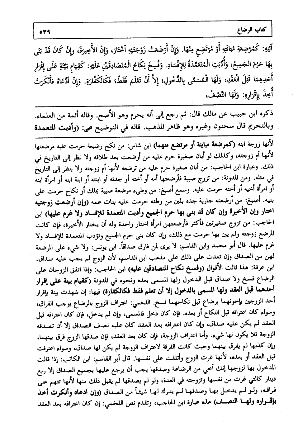 ابنه: كمرضعة مبانته أو مرتضع منها وإن أرضعت زوجتيه اختار وإن الأخيرة وإن كان قد بنى بها حرم الجميع، وأدبت المعتمدة للإفساد وفسخ نكاح المتصادقين عليه كقيام بينة على إقرار أحدهما قبل العقد، ولها المسمى بالدخول إلا أن تعلم فقط فكالكفارة، وإن ادعاه فأنكرت أخذ بإقراره ولها النصف،
