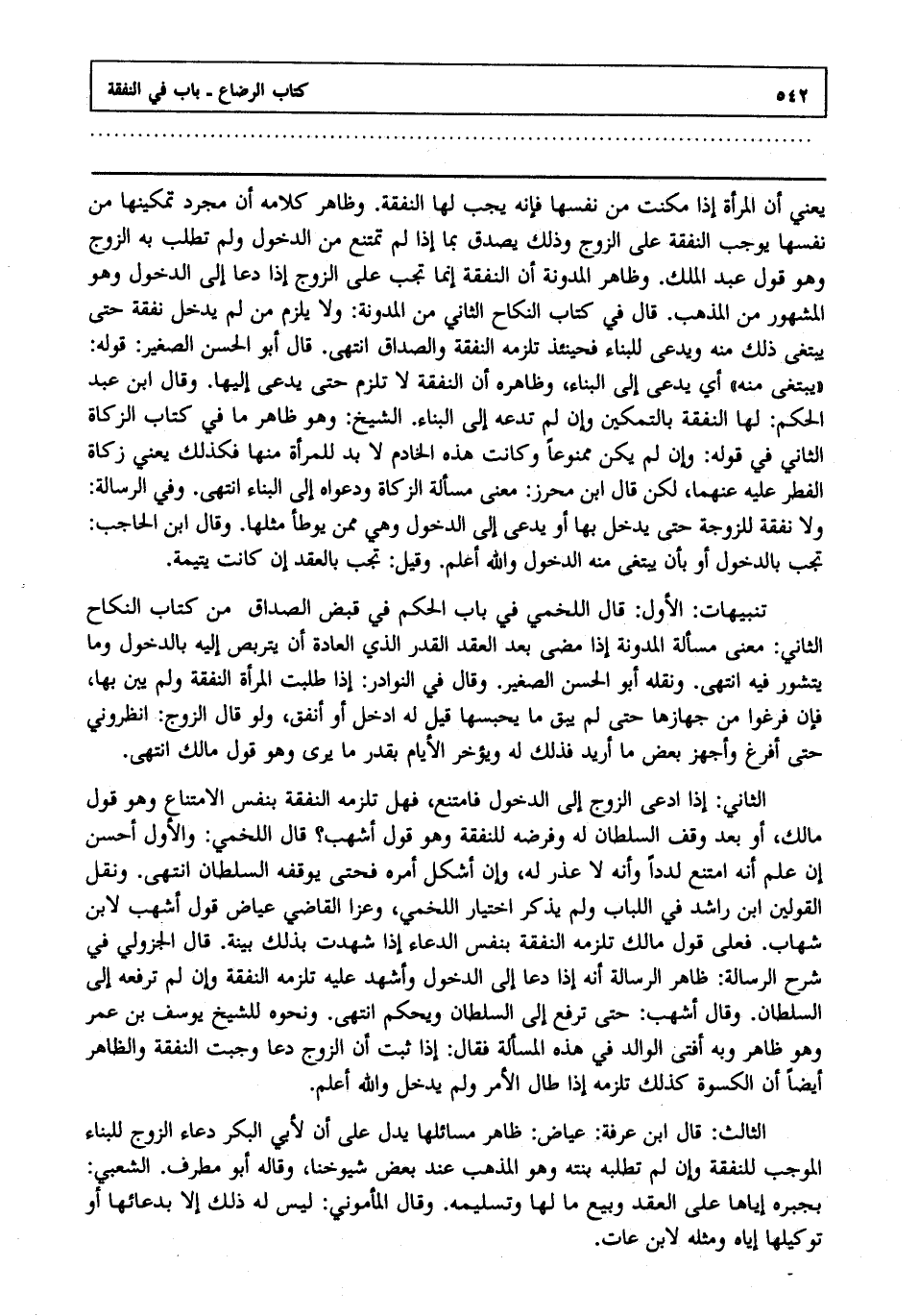 الثاني: إذا ادعى الزوج إلى الدخول فامتنع فهل تلزمه النفقة بنفس الامتناع وهو قول مالك أو بعد وقف السلطان له وفرضه للنفقة وهو قول أشهب؟ قال اللخمي: والأول أحسن إن علم أنه امتنع لددا وأنه لا عذر له وإن أشكل أمره فحتى يوقفه السلطان انتهى. ونقل القولين ابن راشد في اللباب ولم يذكر اختيار اللخمي وعزا القاضي عياض قول أشهب لابن شهاب فعلى قول مالك تلزمه النفقة بنفس الدعاء إذا شهدت بذلك بينة قال الجزولي في شرح الرسالة ظاهر الرسالة أنه إذا دعا إلى الدخول وأشهد عليه تلزمه النفقة وإن لم ترفعه إلى السلطان وقال أشهب حتى ترفع إلى السلطان ويحكم انتهى. ونحوه للشيخ يوسف بن عمر وهو ظاهر وبه أفتى الوالد في هذه المسألة فقال إذا ثبت أن الزوج دعا وجبت النفقة والظاهر أيضا أن الكسوة كذلك تلزمه إذا طال الأمر ولم يدخل والله أعلم.