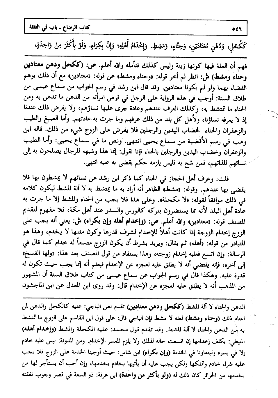 قلت: وعرف أهل الحجاز في الحناء كما ذكر ابن رشد عن نسائهم لا يمشطون بها فلا يقضى بها عندهم وقوله: "مشط" الظاهر أنه أراد به ما يمتشط به لا آلة المشط ليكون كلامه في ذلك موافقا لقوله: "لا مكحلة" وعلى هذا فلا يجب من الحناء والمشط إلا ما جرت به عادة أهل البلد لأنه مما يستضرون بتركه كالورس والسدر عند أهل مكة فلا مفهوم لتقديم المصنف قوله: "معتادين" والله أعلم. ص: "وإخدام أهله وإن بكراء" ش: يعني أنه يجب على الزوج إخدام الزوجة إذا كانت أهلا للإخدام لشرف قدرها وكون مثلها لا يخدم وهذا هو المتبادر من قوله: "أهله" ثم يقال: ويريد بشرط أن يكون الزوج متسعا له خدام كما قال في الرسالة وإن اتسع فعليه إخدام زوجته وهذا يستفاد من قول المصنف بعد هذا: "ولها الفسخ" إلى آخره فإنه يقتضي أنه لا يطلق عليه لعجزه عن الإخدام فيعلم أنه إنما يجب حيث تكون له قدرة عليه وهكذا قال في رسم الجواب عن سماع عيسى من كتاب طلاق السنة أن المشهور من المذهب أنه لا يطلق عليه لعجزه عن الإخدام قال وقد روى ابن المعدل عن ابن الماجشون