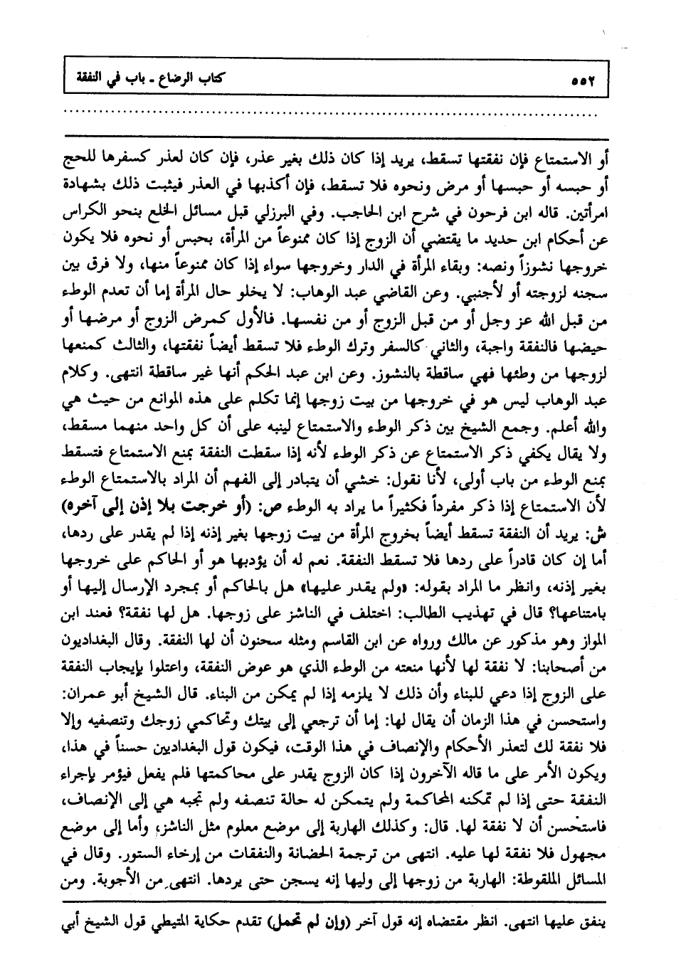 أو الاستمتاع فإن نفقتها تسقط يريد إذا كان ذلك بغير عذر فإن كان لعذر كسفرها للحج أو حبسه أو حبسها أو مرض ونحوه فلا تسقط فإن أكذبها في العذر فيثبت ذلك بشهادة امرأتين قاله ابن فرحون في شرح ابن الحاجب وفي البرزلي قبل مسائل الخلع بنحو الكراس عن أحكام ابن حديد ما يقتضي أن الزوج إذا كان ممنوعا من المرأة بحبس أو نحوه فلا يكون خروجها نشوزا ونصه وبقاء المرأة في الدار وخروجها سواء إذا كان ممنوعا منها ولا فرق بين سجنه لزوجته أو لأجنبي وعن القاضي عبد الوهاب لا يخلو حال المرأة إما أن تعدم الوطء من قبل الله عز وجل أو من قبل الزوج أو من نفسها فالأول كمرض الزوج أو مرضها أو حيضها فالنفقة واجبة والثاني كالسفر وترك الوطء فلا تسقط أيضا نفقتها والثالث كمنعها لزوجها من وطئها فهي ساقطة بالنشوز وعن ابن عبد الحكم أنها غير ساقطة انتهى. وكلام عبد الوهاب ليس هو في خروجها من بيت زوجها إنما تكلم على هذه الموانع من حيث هي والله أعلم. وجمع الشيخ بين ذكر الوطء والاستمتاع لينبه على أن كل واحد منهما مسقط ولا يقال يكفي ذكر الاستمتاع عن ذكر الوطء لأنه إذا سقطت النفقة بمنع الاستمتاع فتسقط بمنع الوطء من باب أولى لأنا نقول خشي أن يتبادر إلى الفهم أن المراد بالاستمتاع الوطء لأن الاستمتاع إذا ذكر مفردا فكثيرا ما يراد به الوطء ص: "أو خرجت بلا إذن إلى آخره" ش: يريد أن النفقة تسقط أيضا بخروج المرأة من بيت زوجها بغير إذنه إذا لم يقدر على ردها أما إن كان قادرا على ردها فلا تسقط النفقة نعم له أن يؤدبها هو أو الحاكم على خروجها بغير إذنه وانظر ما المراد بقوله: