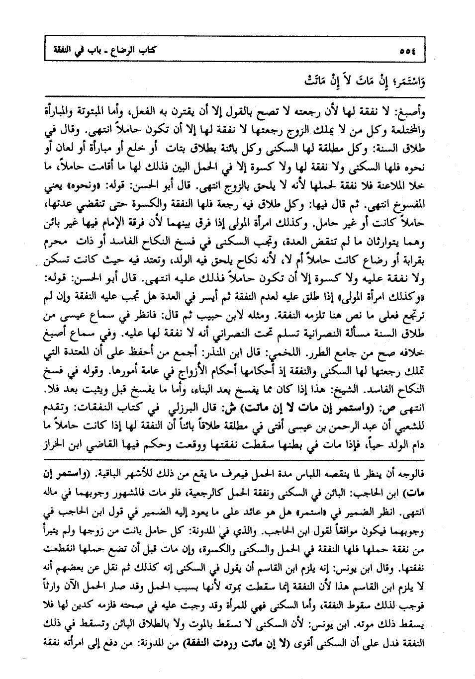 وأصبغ: لا نفقة لها لأن رجعته لا تصح بالقول إلا أن يقترن به الفعل وأما المبتوتة والمبارأة والمختلعة وكل من لا يملك الزوج رجعتها لا نفقة لها إلا أن تكون حاملا انتهى. وقال في طلاق السنة وكل مطلقة لها السكنى وكل بائنة بطلاق بتات أو خلع أو مبارأة أو لعان أو نحوه فلها السكنى ولا نفقة لها ولا كسوة إلا في الحمل البين فذلك لها ما أقامت حاملا ما خلا الملاعنة فلا نفقة لحملها لأنه لا يلحق بالزوج انتهى. قال أبو الحسن: قوله: "ونحوه" يعني المفسوخ انتهى. ثم قال فيها: وكل طلاق فيه رجعة فلها النفقة والكسوة حتى تنقضي عدتها حاملا كانت أو غير حامل وكذلك امرأة المولى إذا فرق بينهما لأن فرقة الإمام فيها غير بائن وهما يتوارثان ما لم تنقض العدة وتجب السكنى في فسخ النكاح الفاسد أو ذات محرم بقرابة أو رضاع كانت حاملا أم لا لأنه نكاح يلحق فيه الولد وتعتد فيه حيث كانت تسكن ولا نفقة عليه ولا كسوة إلا أن تكون حاملا فذلك عليه انتهى. قال أبو الحسن: قوله: "وكذلك امرأة المولى" إذا طلق عليه لعدم النفقة ثم أيسر في العدة هل تجب عليه النفقة وإن لم ترتجع فعلى ما نص هنا تلزمه النفقة ومثله لابن حبيب ثم قال: فانظر في سماع عيسى من طلاق السنة مسألة النصرانية تسلم تحت النصراني أنه لا نفقة لها عليه وفي سماع أصبغ خلافه صح من جامع الطرر اللخمي قال ابن المنذر: أجمع من أحفظ على أن المعتدة التي تملك رجعتها لها السكنى والنفقة إذ أحكامها أحكام الأزواج في عامة أمورها وقوله في فسخ النكاح الفاسد الشيخ هذا إذا كان مما يفسخ بعد البناء وأما ما يفسخ قبل ويثبت بعد فلا انتهى. ص: "واستمر إن مات لا إن ماتت" ش: قال البرزلي في كتاب النفقات وتقدم للشعبي أن عبد الرحمن بن عيسى أفتى في مطلقة طلاقا بائنا أن النفقة لها إذا كانت حاملا ما دام الولد حيا فإذا مات في بطنها سقطت نفقتها ووقعت وحكم فيها القاضي ابن الخراز