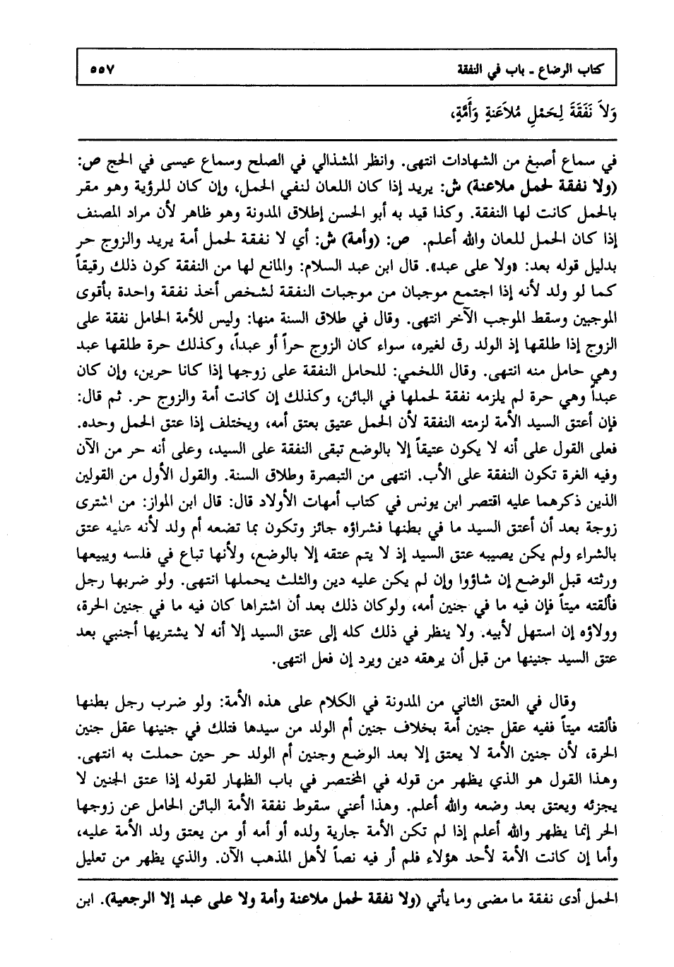 في سماع أصبغ من الشهادات انتهى. وانظر المشذالي في الصلح وسماع عيسى في الحج ص: "ولا نفقة لحمل ملاعنة" ش: يريد إذا كان اللعان لنفي الحمل وإن كان للرؤية وهو مقر بالحمل كانت لها النفقة وكذا قيد به أبو الحسن إطلاق المدونة: وهو ظاهر لأن مراد المصنف إذا كان الحمل للعان والله أعلم. ص: "وأمة" ش: أي لا نفقة لحمل أمة يريد والزوج حر بدليل قوله بعد: "ولا على عبد" قال ابن عبد السلام: والمانع لها من النفقة كون ذلك رقيقا كما لو ولد لأنه إذا اجتمع موجبان من موجبات النفقة لشخص أخذ نفقة واحدة بأقوى الموجبين وسقط الموجب الآخر انتهى. وقال في طلاق السنة منها: وليس للأمة الحامل نفقة على الزوج إذا طلقها إذ الولد رق لغيره سواء كان الزوج حرا أو عبدا وكذلك حرة طلقها عبد وهي حامل منه انتهى. وقال اللخمي: للحامل النفقة على زوجها إذا كانا حرين وإن كان عبدا وهي حرة لم يلزمه نفقة لحملها في البائن وكذلك إن كانت أمة والزوج حر ثم قال فإن أعتق السيد الأمة لزمته النفقة لأن الحمل عتيق بعتق أمه ويختلف إذا عتق الحمل وحده فعلى القول على أنه لا يكون عتيقا إلا بالوضع تبقى النفقة على السيد وعلى أنه حر من الآن وفيه الغرة تكون النفقة على الأب انتهى. من التبصرة وطلاق السنة والقول الأول من القولين الذين ذكرهما عليه اقتصر ابن يونس في كتاب أمهات الأولاد قال قال ابن المواز من اشترى زوجة بعد أن أعتق السيد ما في بطنها فشراؤه جائز وتكون بما تضعه أم ولد لأنه عليه عتق بالشراء ولم يكن يصيبه عتق السيد إذ لا يتم عتقه إلا بالوضع ولأنها تباع في فلسه ويبيعها ورثته قبل الوضع إن شاؤوا وإن لم يكن عليه دين والثلث يحملها انتهى. ولو ضربها رجل فألقته ميتا فإن فيه ما في جنين أمه ولو كان ذلك بعد أن اشتراها كان فيه ما في جنين الحرة وولاؤه إن استهل لأبيه ولا ينظر في ذلك كله إلى عتق السيد إلا أنه لا يشتريها أجنبي بعد عتق السيد جنينها من قبل أن يرهقه دين ويرد إن فعل انتهى.