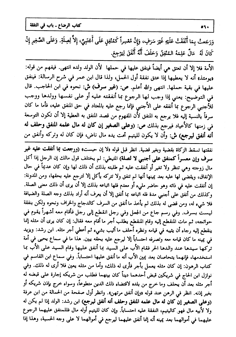 الأمة فلا إلا أن تعتق هي أيضا فينفق عليها في حملها لأن الولد ولده انتهى. فيفهم من قوله: "يومئذ "أنه لا يعطيها إذا عتق نفقة أول الحمل ولذا قال ابن عمر في شرح الرسالة: فينفق عليها في بقية حملها انتهى. والله أعلم. ص: "غير سرف" ش: نحوه في ابن الحاجب قال في التوضيح: يعني إذا وجب لها الرجوع بما أنفقته عليه أو على نفسها وولدها ووجب للأجنبي الرجوع بما أنفقه على الأجنبي فإنما رجع عليه بالمعتاد في حق المنفق عليه فأما ما كان سرفا بالنسبة إليه فلا يرجع به المنفق لأن المفهوم من قصد المنفق به العطية إلا أن تكون التوسعة في زمنها كالأعياد فيرجع بذلك ص: "وعلى الصغير إن كان له مال علمه المنفق وحلف له أنه أنفق ليرجع" ش: وأن لا يكون لليتيم تحت يده مال ناض فإن كان له وتركه وأنفق من