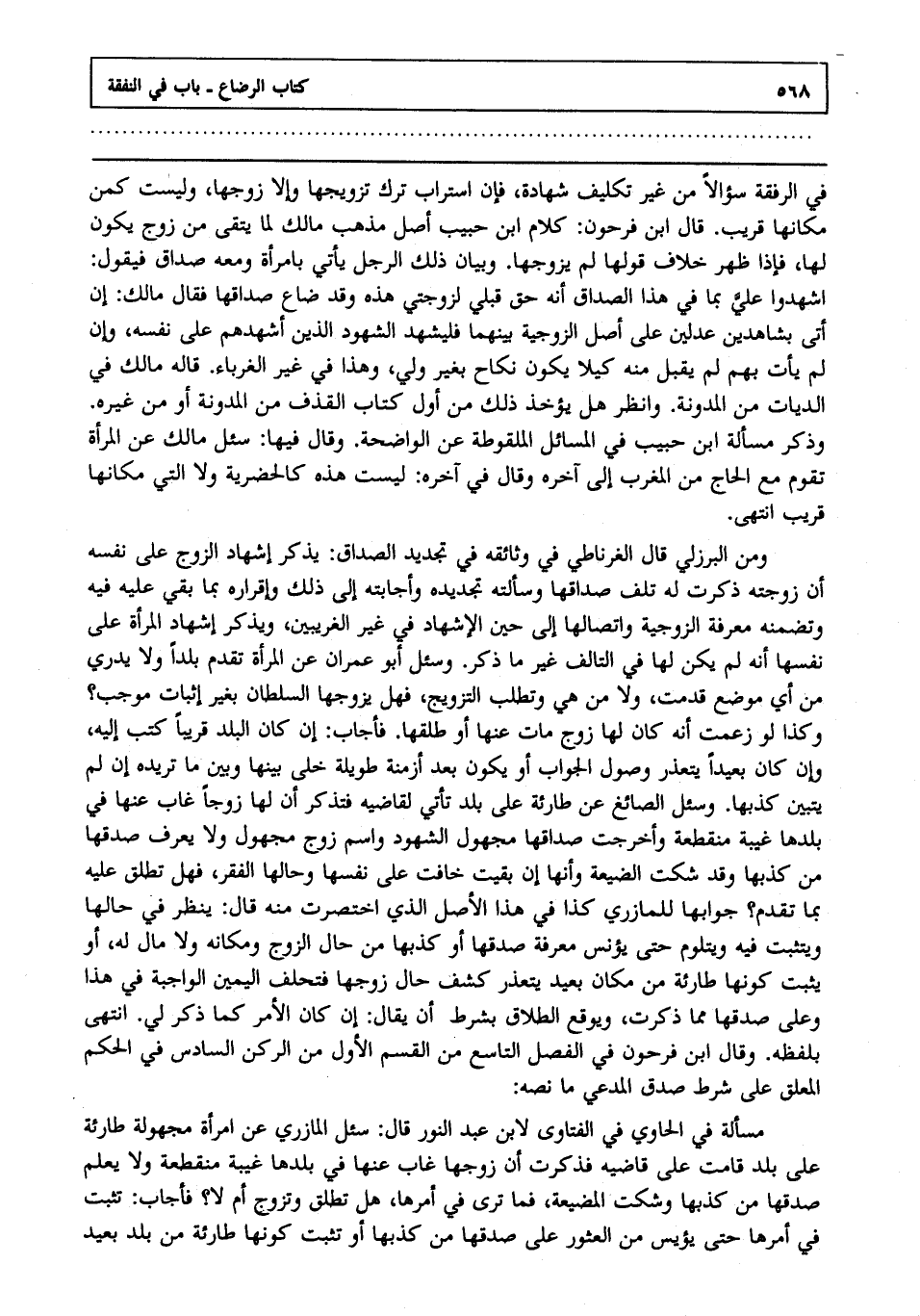 ومن البرزلي قال الغرناطي في وثائقه في تجديد الصداق: يذكر إشهاد الزوج على نفسه أن زوجته ذكرت له تلف صداقها وسألته تجديده وأجابته إلى ذلك وإقراره بما بقي عليه فيه وتضمنه معرفة الزوجية واتصالها إلى حين الإشهاد في غير الغريبين ويذكر إشهاد المرأة على نفسها أنه لم يكن لها في التالف غير ما ذكر وسئل أبو عمران عن المرأة تقدم بلدا ولا يدري من أي موضع قدمت ولا من هي وتطلب التزويج فهل يزوجها السلطان بغير إثبات موجب وكذا لو زعمت أنه كان لها زوج مات عنها أو طلقها فأجاب إن كان البلد قريبا كتب إليه وإن كان بعيدا يتعذر وصول الجواب أو يكون بعد أزمنة طويلة خلى بينها وبين ما تريده إن لم يتبين كذبها وسئل الصائغ عن طارئة على بلد تأتي لقاضيه فتذكر أن لها زوجا غاب عنها في بلدها غيبة منقطعة وأخرجت صداقها مجهول الشهود واسم زوج مجهول ولا يعرف صدقها من كذبها وقد شكت الضيعة وأنها إن بقيت خافت على نفسها وحالها الفقر فهل تطلق عليه بما تقدم جوابها للمازري كذا في هذا الأصل الذي اختصرت منه قال ينظر في حالها ويتثبت فيه ويتلوم حتى يؤنس معرفة صدقها أو كذبها من حال الزوج ومكانه ولا مال له أو يثبت كونها طارئة من مكان بعيد يتعذر كشف حال زوجها فتحلف اليمين الواجبة في هذا وعلى صدقها مما ذكرت ويوقع الطلاق بشرط أن يقال إن كان الأمر كما ذكر لي انتهى. بلفظ وقال ابن فرحون في الفصل التاسع من القسم الأول من الركن السادس في الحكم المعلق على شرط صدق المدعي ما نصه.