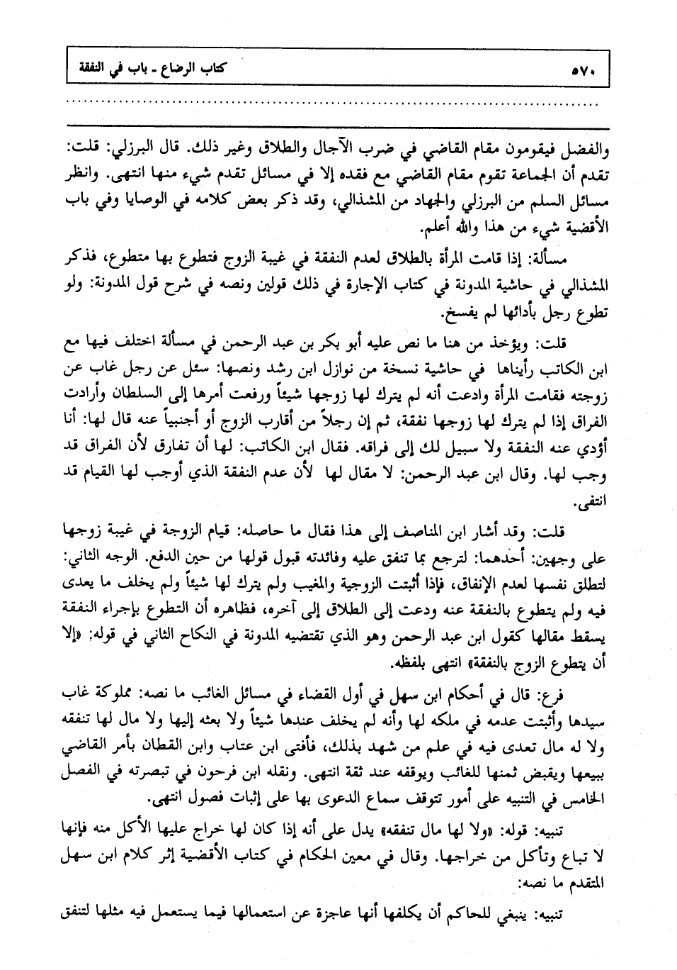 قلت: ويؤخذ من هنا ما نص عليه أبو بكر بن عبد الرحمن في مسألة اختلف فيها مع ابن الكاتب رأيناها في حاشية نسخة من نوازل ابن رشد ونصها: سئل عن رجل غاب عن زوجته فقامت المرأة وادعت أنه لم يترك لها زوجها شيئا ورفعت أمرها إلى السلطان وأرادت الفراق إذا لم يترك لها زوجها نفقة ثم إن رجلا من أقارب الزوج أو أجنبيا عنه قال لها: أنا أؤدي عنه النفقة ولا سبيل لك إلى فراقه فقال ابن الكاتب لها أن تفارق لأن الفراق قد وجب لها وقال ابن عبد الرحمن لا مقال لها لأن عدم النفقة الذي أوجب لها القيام قد انتفى.