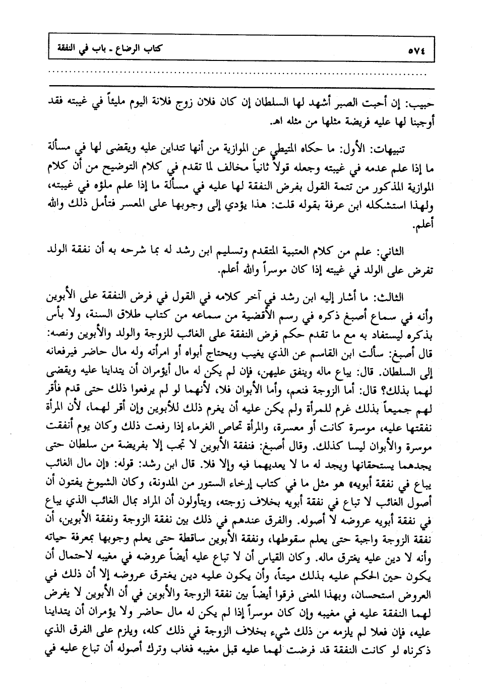 الثاني: علم من كلام العتبية المتقدم وتسليم ابن رشد له بما شرحه به أن نفقة الولد تفرض على الولد في غيبته إذا كان موسرا والله أعلم.