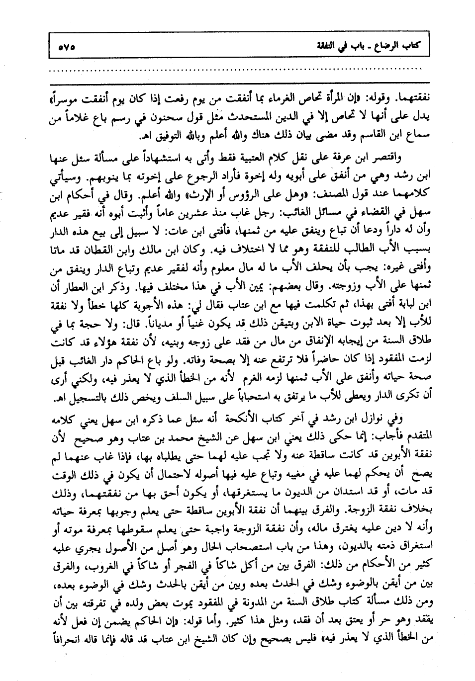وفي نوازل ابن رشد في آخر كتاب الأنكحة أنه سئل عما ذكره ابن سهل يعني كلامه المتقدم فأجاب إنما حكى ذلك يعني ابن سهل عن الشيخ محمد بن عتاب وهو صحيح لأن نفقة الأبوين قد كانت ساقطة عنه ولا تجب عليه لهما حتى يطلباه بها فإذا غاب عنهما لم يصح أن يحكم لهما عليه في مغيبه وتباع عليه فيها أصوله لاحتمال أن يكون في ذلك الوقت قد مات أو قد استدان من الديون ما يستغرقها أو يكون أحق بها من نفقتهما وذلك بخلاف نفقة الزوجة والفرق بينهما أن نفقة الأبوين ساقطة حتى يعلم وجوبها بمعرفة حياته وأنه لا دين عليه يغترق ماله وأن نفقة الزوجة واجبة حتى يعلم سقوطها بمعرفة موته أو استغراق ذمته بالديون وهذا من باب استصحاب الحال وهو أصل من الأصول يجري عليه كثير من الأحكام من ذلك الفرق بين من أكل شاكا في الفجر أو شاكا في الغروب والفرق بين من أيقن بالوضوء وشك في الحدث بعده وبين من أيقن بالحدث وشك في الوضوء بعده ومن ذلك مسألة كتاب طلاق السنة من المدونة: في المفقود يموت بعض ولده في تفرقته بين أن يفقد وهو حر أو يعتق بعد أن فقد ومثل هذا كثير وأما قوله: "إن الحاكم يضمن إن فعل لأنه من الخطأ الذي لا يعذر فيه" فليس بصحيح وإن كان الشيخ ابن عتاب قد قاله فإنما قاله انحرافا