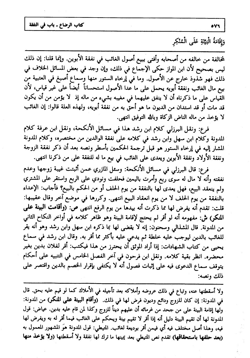 فرع: ونقل البرزلي كلام ابن رشد هذا في مسائل الأنكحة ونقل ابن عرفة كلام المدونة: وكلام ابن سهل وابن رشد في كلامه على نفقة الوالدين من مختصره وكلام المدونة: المشار إليه في إرخاء الستور هو قبل ترجمة الحكمين بأسطر ونصه بعد أن ذكر نفقة الزوجة ونفقة الأولاد ونفقة الأبوين ويعدى على الغائب في بيع ما له للنفقة على من ذكرنا انتهى.