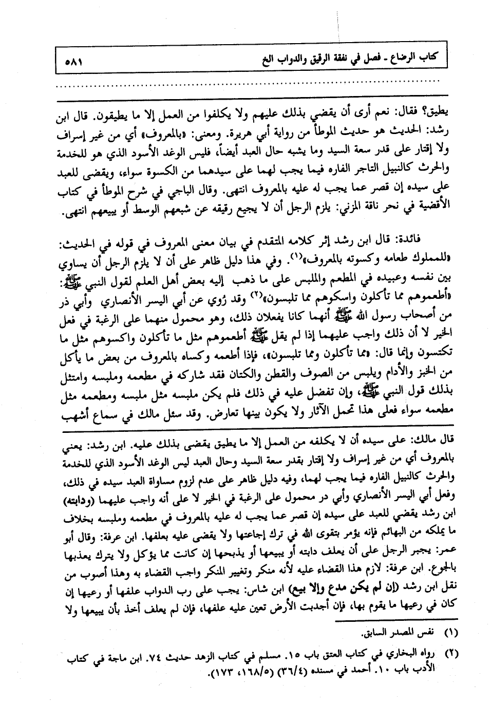 يطيق؟ فقال: نعم أرى أن يقضي بذلك عليهم ولا يكلفوا من العمل إلا ما يطيقون قال ابن رشد: الحديث هو حديث الموطأ من رواية أبي هريرة ومعنى: "بالمعروف" أي من غير إسراف ولا إقتار على قدر سعة السيد وما يشبه حال العبد أيضا فليس الوغد الأسود الذي هو للخدمة والحرث كالنبيل التاجر الفاره فيما يجب لهما على سيدهما من الكسوة سواء ويقضى للعبد على سيده إن قصر عما يجب له عليه بالمعروف انتهى. وقال الباجي في شرح الموطأ في كتاب الأقضية في نحر ناقة المزني يلزم الرجل أن لا يجيع رقيقه عن شبعهم الوسط أو يبيعهم انتهى.
