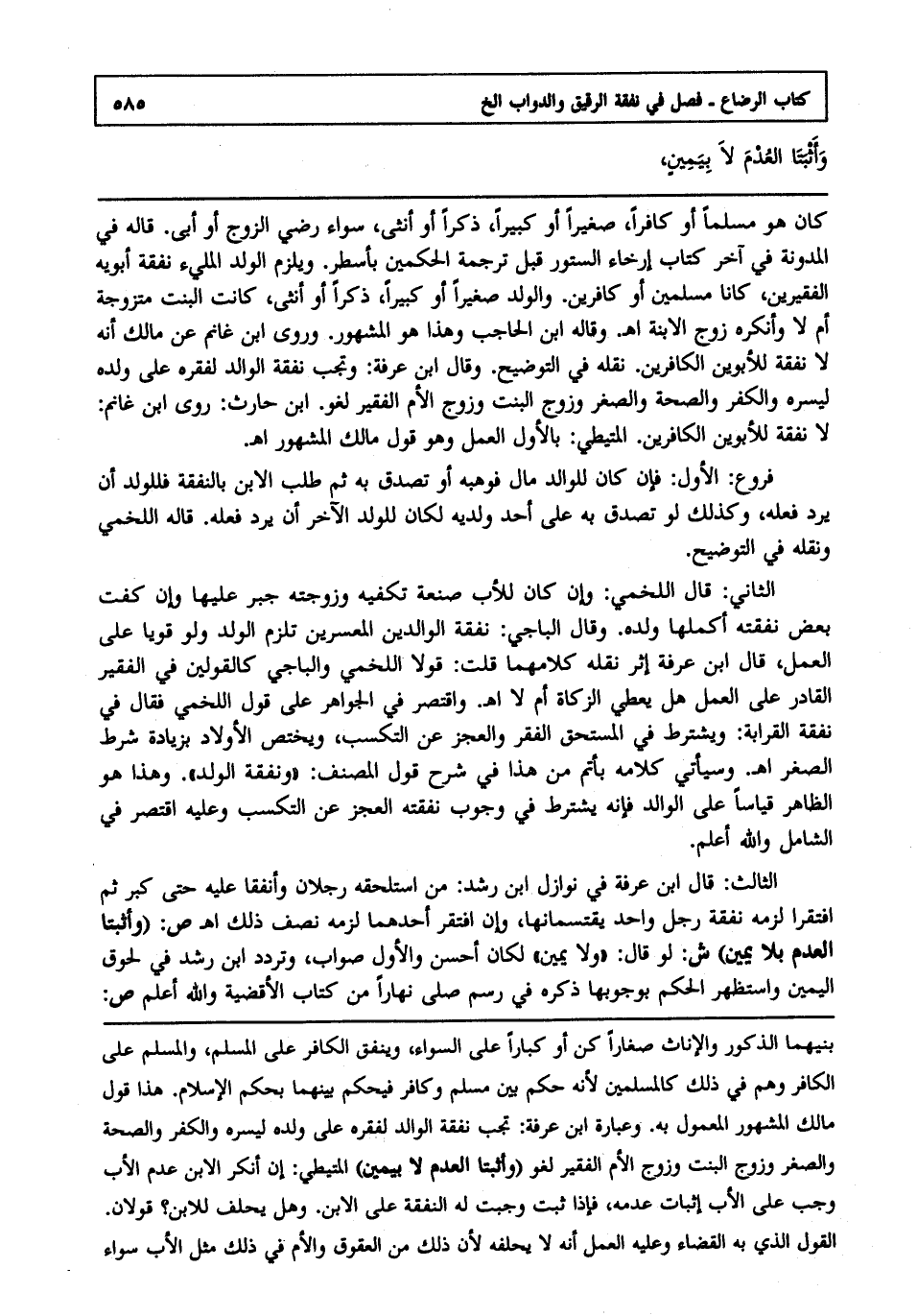 الثالث: قال ابن عرفة في نوازل ابن رشد: من استلحقه رجلان وأنفقا عليه حتى كبر ثم افتقرا لزمه نفقة رجل واحد يقتسمانها وإن افتقر أحدهما لزمه نصف ذلك انتهى. ص: "وأثبتا العدم بلا يمين" ش: لو قال: "ولا يمين" لكان أحسن والأول صواب وتردد ابن رشد في لحوق اليمين واستظهر الحكم بوجوبها ذكره في رسم صلى نهارا من كتاب الأقضية والله أعلم.ص: "