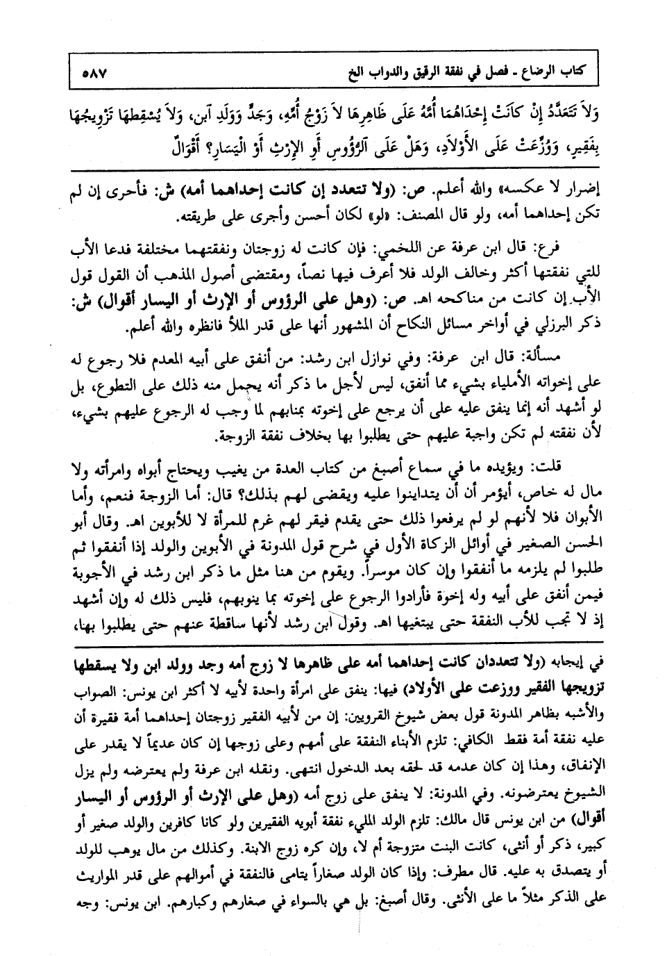 ولا تتعدد إن كانت إحداهما أمه على ظاهرها لا زوج أمه وجد وولد ابن ولا يسقطها تزويجها بفقير ووزعت على الأولاد وهل على الرؤوس أو الإرث أو اليسار؟ أقوال