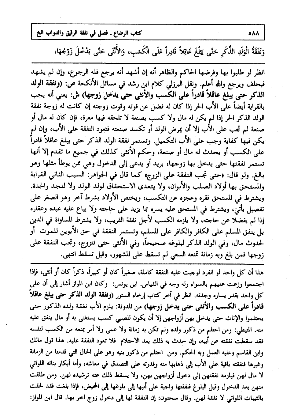 انظر لو طلبوا بها وفرضها الحاكم والظاهر أنه إن أشهد أنه يرجع فله الرجوع وإن لم يشهد فيحلف ويرجع والله أعلم. ونقل البرزلي كلام ابن رشد في مسائل الأنكحة ص: "ونفقة الولد الذكر حتى يبلغ عاقلا قادرا على الكسب والأنثى حتى يدخل زوجها" ش: يعني أنه يجب بالقرابة أيضا على الأب الحر إذا كان له فضل عن قوته وقوت زوجته إن كانت له زوجة نفقة الولد الذكر الحر إذا لم يكن له مال ولا كسب بصنعة لا تلحقه فيها معرة فإن كان له مال أو صنعة لم تجب على الأب إلا أن يمرض الولد أو تكسد صنعته فتعود النفقة على الأب وإن لم يكن فيها كفاية وجب على الأب التكميل وتستمر نفقة الولد الذكر حتى يبلغ عاقلا قادرا على الكسب أو يحدث له مال أو صنعة وحكم الأنثى كذلك في جميع ما تقدم إلا أنها تستمر نفقتها حتى يدخل بها زوجها يريد أو يدعى إلى الدخول وهي ممن يوطأ مثلها.وهو بالغ..ولو قال: "حتى تجب النفقة على الزوج" كما قال في الجواهر: السبب الثاني القرابة والمستحق بها أولاد الصلب والأبوان ولا يتعدى الاستحقاق لولد الولد ولا للجد والجدة ويشترط في المستحق فقره وعجزه عن التكسب ويختص الأولاد بشرط آخر وهو الصغر على تفصيل يأتي ويشترط في المستحق عليه يسره بما يزيد على حاجته ولا يباع عليه عبده وعقاره إذا لم يفضلا عن حاجته ولا يلزمه الكسب لأجل نفقة القريب ولا يشترط المساواة في الدين بل ينفق المسلم على الكافر والكافر على المسلم وتستمر النفقة في حق الأبوين للموت أو لحدوث مال وفي الولد الذكر لبلوغه صحيحا وفي الأنثى حتى تتزوج وتجب النفقة على زوجها فمن بلغ وبه زمانة تمنعه السعي لم تسقط على المشهور وقيل تسقط انتهى.