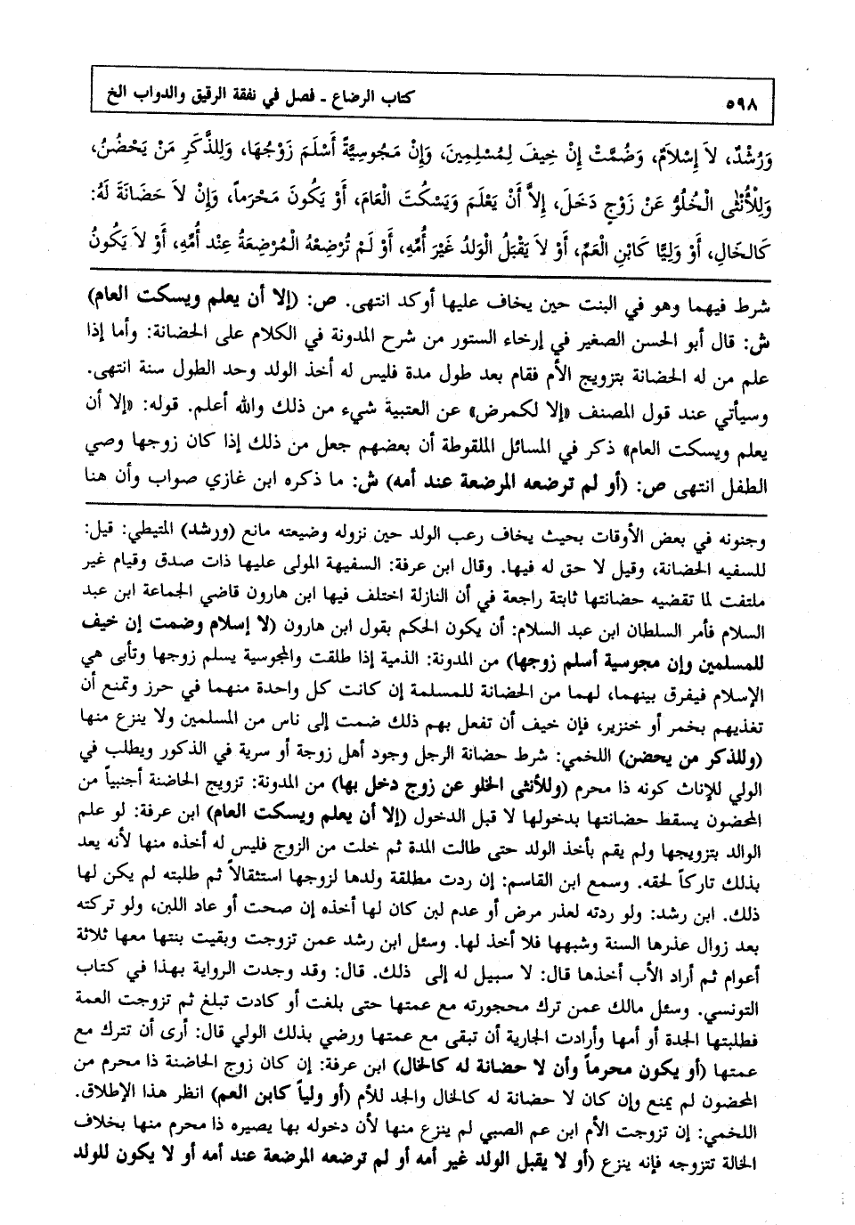 ورشد لا إسلام وضمت إن خيف لمسلمين وإن مجوسية أسلم زوجها وللذكر من يحضن وللأنثى الخلو عن زوج دخل إلا أن يعلم ويسكت العام أو يكون محرما وإن لا حضانة له كالخال أو وليا كابن العم أو لا يقبل الولد غير أمه أو لم ترضعه المرضعة عند أمه أو لا يكون