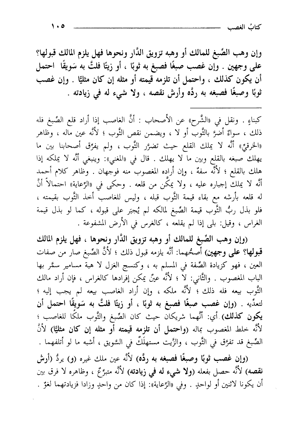 "وإن وهب الصبغ للمالك أو وهبة تزويق الدار ونحوها فهل يلزم المالك قبولها على وجهين" أصحهما أنه يلزمه قبول ذلك لأن الصبغ صار من صفات العين فهو كزيادة الصفة في المسلم به وكنسج الغزل لا هبة مسامير سمر بها الباب المغصوب والثاني لا لأنه عين يمكن إفرادها كالغراس فإن أراد مالك الثوب بيعه فله ذلك لأنه ملكه وإن أراد الغاصب بيعه لم يجب إليه لتعديه "وإن غصب صبغا فصبغ به ثوبا أو زيتا فلت به سويقا احتمل أن يكون كذلك" أي أنهما شريكان حيث كان الصبغ والثوب ملكا للغاصب لأنه خلط المغصوب بماله "واحتمل أن تلزمه قيمته أو مثله إن كان مثليا" لأن الصبغ قد تفرق في الثوب والزيت مستهلك في السويق أشبه ما لو أتلفهما.