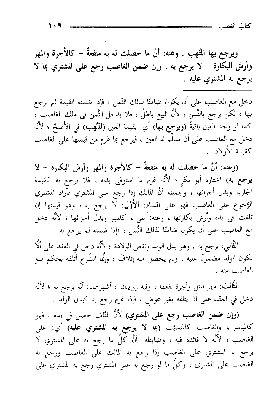 "وعنه: أن ما حصلت له به منفعة كالأجرة والمهر وأرش البكارة لا يرجع به" اختاره أبو بكر لأنه غرم ما استوفى بدله فلا يرجع به كقيمة الجارية وبدل اجزائها وجملته أن المالك إذا رجع على المشتري فأراد المشتري الرجوع على الغاصب فهو على أقسام الأول لا يرجع به وهو قيمتها إن تلفت في يده وأرش بكارتها وعنه بلى كالمهر وبدل أجزائها لانه دخل مع الغاصب على أن يكون ضامنا لذلك الثمن فإذا ضمنه لم يرجع به