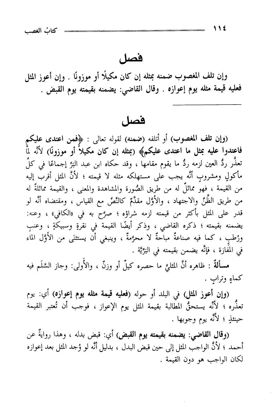"وإن تلف المغصوب" أو أتلفه "ضمنه" لقوله تعالى {فَمَنِ اعْتَدَى عَلَيْكُمْ فَاعْتَدُوا عَلَيْهِ بِمِثْلِ مَا اعْتَدَى عَلَيْكُمْ} "بمثله إن كان مكيلا أو موزونا" لأنه لما تعذر رد العين لزمه رد ما يقوم مقامها وقد حكاه ابن عبد البر إجماعا في كل مأكول ومشروب أنه يجب على مستهلكه مثله لا قيمته لأن المثل أقرب إليه من القيمة فهو مماثل له من طريق الصورة والمشاهدة والمعنى والقيمة مماثلة له من طريق الظن والاجتهاد والأول مقدم كالنص مع القياس ومقتضاه أنه لو قدر على المثل بأكثر من قيمته لزمه شراؤه صرح به في الكافي وعنه يضمنه بقيمته ذكره القاضي وذكر أيضا القيمة في نقرة وسبيكة وعنب ورطب كما فيه صناعة مباحة لا محرمة وينبغي أن يستثنى من الأول الماء في المفازة فإنه يضمن بقيمته في البرية