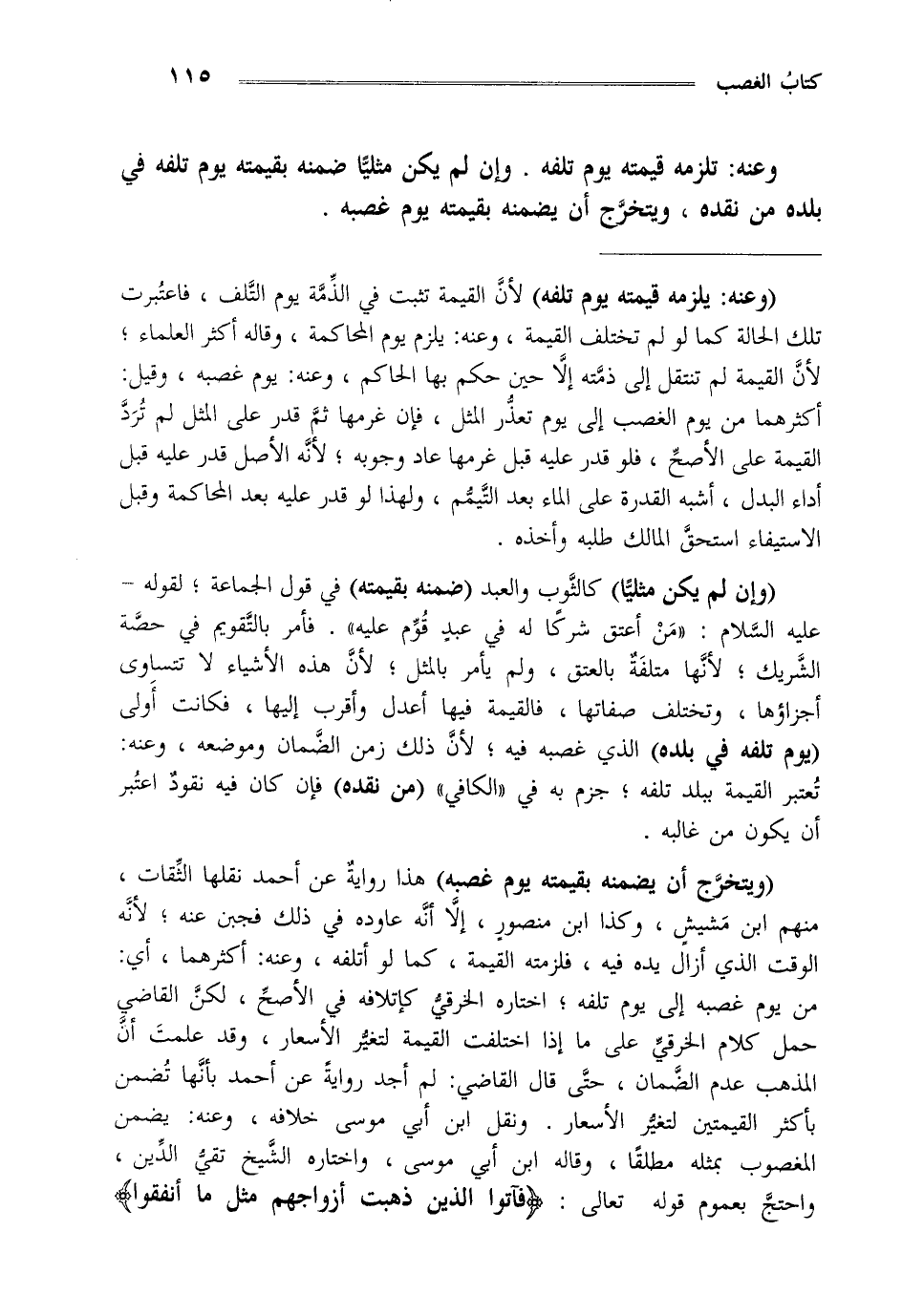 "إن لم يكن مثليا" كالثوب والعبد "ضمنه بقيمته" في قول الجماعة لقوله عليه السلام : "من أعتق شركا له في عبد قوم عليه" فأمر بالتقويم في حصة الشريك لأنها متلفة بالعتق ولم يأمر بالمثل لأن هذه الأشياء لا تتساوى أجزاؤها وتختلف صفاتها فالقيمة فيها أعدل وأقرب إليها فكانت أولى "يوم تلفه في بلده" الذي غصبه فيه لأن ذلك زمن الضمان وموضعه وعنه تعتبر القيمة ببلد تلفه جزم به في الكافي "من نقده" فإن كان فيه نقود اعتبر أن يكون من غالبه .