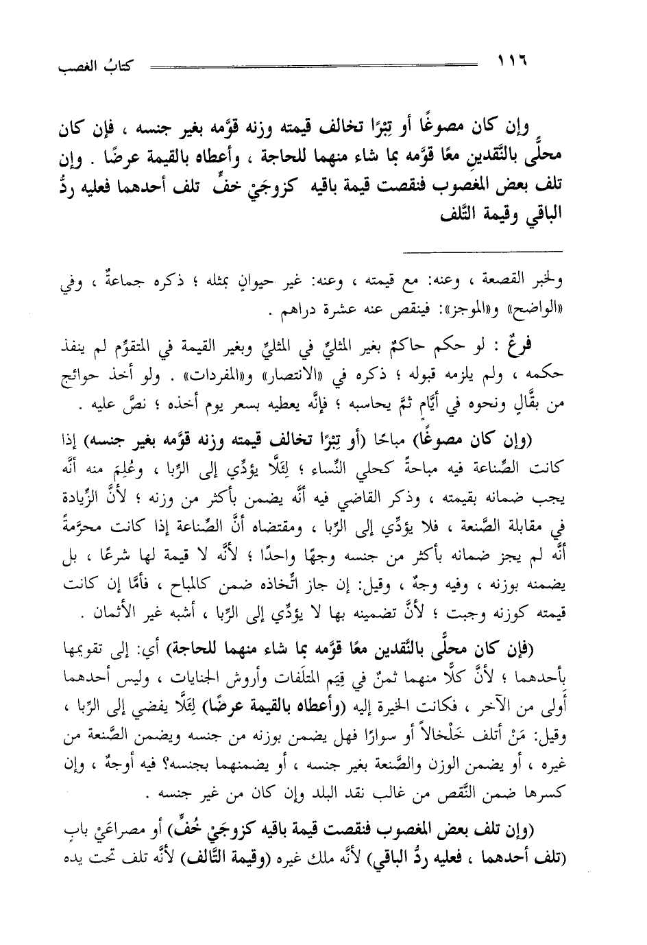 "وإن كان مصوغا" مباحا "أو تبرا تخالف قيمته وزنه قومه بغير جنسه" إذا كانت الصناعة فيه مباحة كحلي النساء لئلا يؤدي إلى الربا وعلم منه أنه يجب ضمانه بقيمته وذكر القاضي فيه أنه يضمن بأكثر من وزنه لأن الزيادة في مقابلة الصنعة فلا يؤدي إلى الربا ومقتضاه أن الصناعة إذا أنه لم يجز ضمانه بأكثر من جنسه وجها واحدا لأنه لا قيمة لها شرعا بل يضمنه بوزنه وفيه وجه وقيل إن جاز اتخاذه ضمن كالمباح فاما إن كانت قيمته كوزنه وجبت لأن تضمينه بها لا يؤدي إلى الربا أشبه غيرالأثمان.