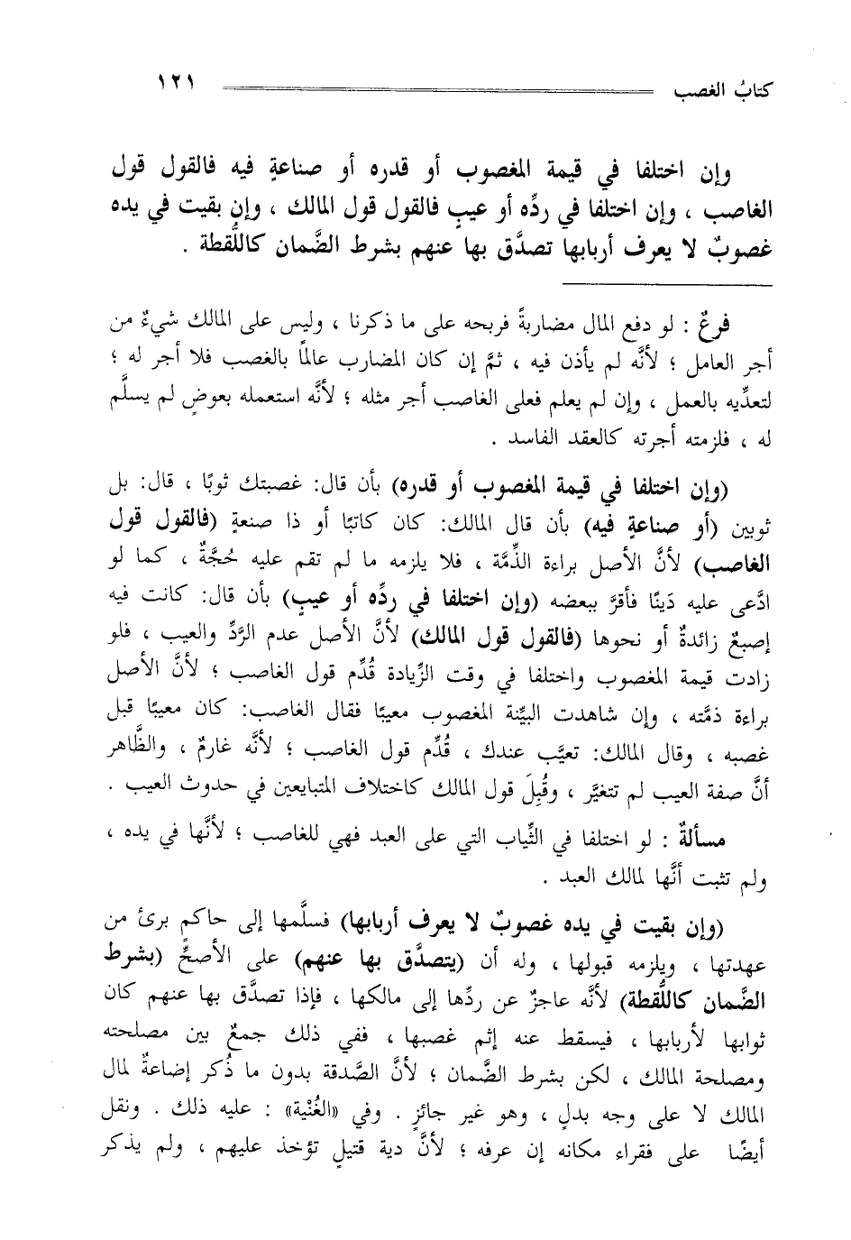 "وإن اختلفا في قيمة المغصوب أو قدره" بأن قال غصبتك ثوبا قال بل ثوبين "أو صناعة فيه" بان قال المالك كان كاتبا أو ذا صنعة "فالقول قول الغاصب" لأن الأصل براءة الذمة فلا يلزمه ما لم تقم عليه حجة كما لو ادعى عليه دينا فأقر بعضه "وإن اختلفا في رده أو عيب" بأن قال كانت فيه أصبع زائدة أو نحوها "فالقول قول المالك" لأن الأصل عدم الرد والعيب فلو زادت قيمة المغصوب واختلفا في وقت الزيادة قدم قول الغاصب لأن الأصل براءة ذمته وإن شاهدت البينة المغصوب معيبا فقال الغاصب كان معيبا قبل غصبه وقال المالك تعيب عندك قدم قول الغاصب لأنه غارم والظاهر أن صفة العبد لم تتغير وقبل قول المالك كاختلاف المتبايعين في حدوث العيب