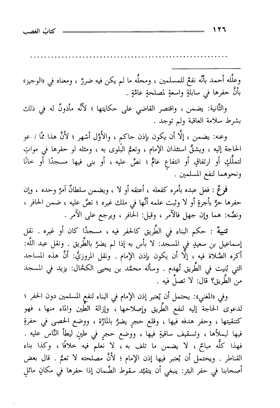 تنبيه: حكم البناء في الطريق كالحفر فيه مسجدا كان أو غيره نقل إسماعيل بن سعيد في المسجد لا بأس به إذا لم يضر الطريق ونقل عبد الله أكره الصلاة فيه إلا أن يكون بإذن الإمام ونقل المروذي ان هده المساجد التي بنيت في الطريق تهدم وسأله محمد بن يحيى الكحال يزيد في المسجد من الطريق قال لا تصلي فيه