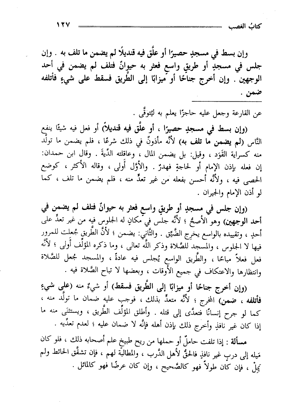 "وان بسط في مسجد حصيرا أو علق فيه قنديلا" أو فعل فيه شيئا ينفع الناس "لم يضمن ما تلف به" لأنه مأذون في ذلك شرعا فلم يضمن ما تولد منه كسراية القود وقيل بل يضمن المال وعاقلته والدية وقال ابن حمدان ان فعله بإذن الإمام أو لحاجة فهدر والأول أولى وقاله الأكثر كوضع حصى فيه لأنه أحسن بفعله من غيرتعد منه فلم يضمن ما تلف كما لو أذن الإمام والجيران.