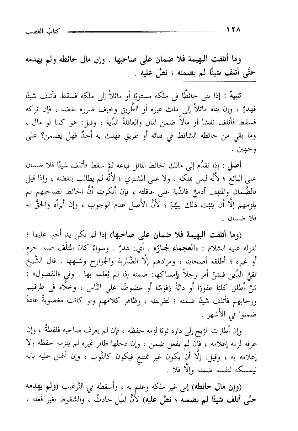 تنبيه: اذا بنى حائطا في ملكه مستويا أو مائلا الى ملكه فسقط فأتلف شيئا فهدر وان بناه مائلا الى ملك غيره أو الطريق وخيف ضرره نقضه فإن تركه فسقط فأتلف نفسا أو مالا ضمن المال والعاقلة الدية وقيل هو كما لو مال بقى و ما من حائطه الساقط في فنائه أو طريق فهلك به احد فهل يضمن على وجهين