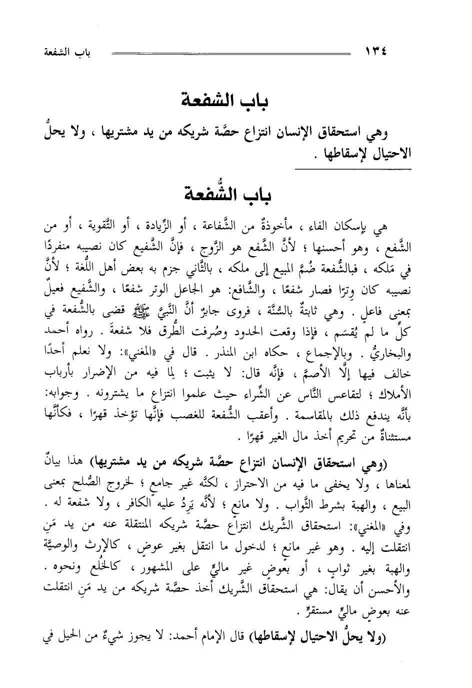 هي بإسكان الفاء مأخوذة من الشفاعة أو الزيادة أو التقوية أو من الشفع وهو أحسنها لأن الشفع هو الزوج فإن الشفيع كان نصيبه منفردا في ملكه فبالشفعة ضم المبيع إلى ملكه وبالثاني جزم به بعض أهل اللغة لأن نصيبه كان وترا فصار شفعا والشافع هو الجاعل الوتر شفعا والشفيع فعيل بمعنى فاعل وهي ثابتة بالسنة فروى جابر "أن النبي صلى الله عليه وسلم قضى بالشفعة في كل ما لم يقسم فإذا وقعت الحدود وصرفت الطرق فلا شفعة" رواه أحمد والبخاري وبالإجماع حكاه ابن المنذر قال في المغني ولا نعلم أحدا خالف فيها إلا الأصم فإنه قال لا يثبت لما فيه من الإضرار بأرباب الأملاك لتقاعس الناس عن الشراء حيث علموا انتزاع ما يشترونه وجوابه بأنه يندفع ذلك بالمقاسمة وأعقب الشفعة للغصب فإنها تؤخذ قهرا فكأنها مستثناة من تحريم أخذ مال الغير قهرا.