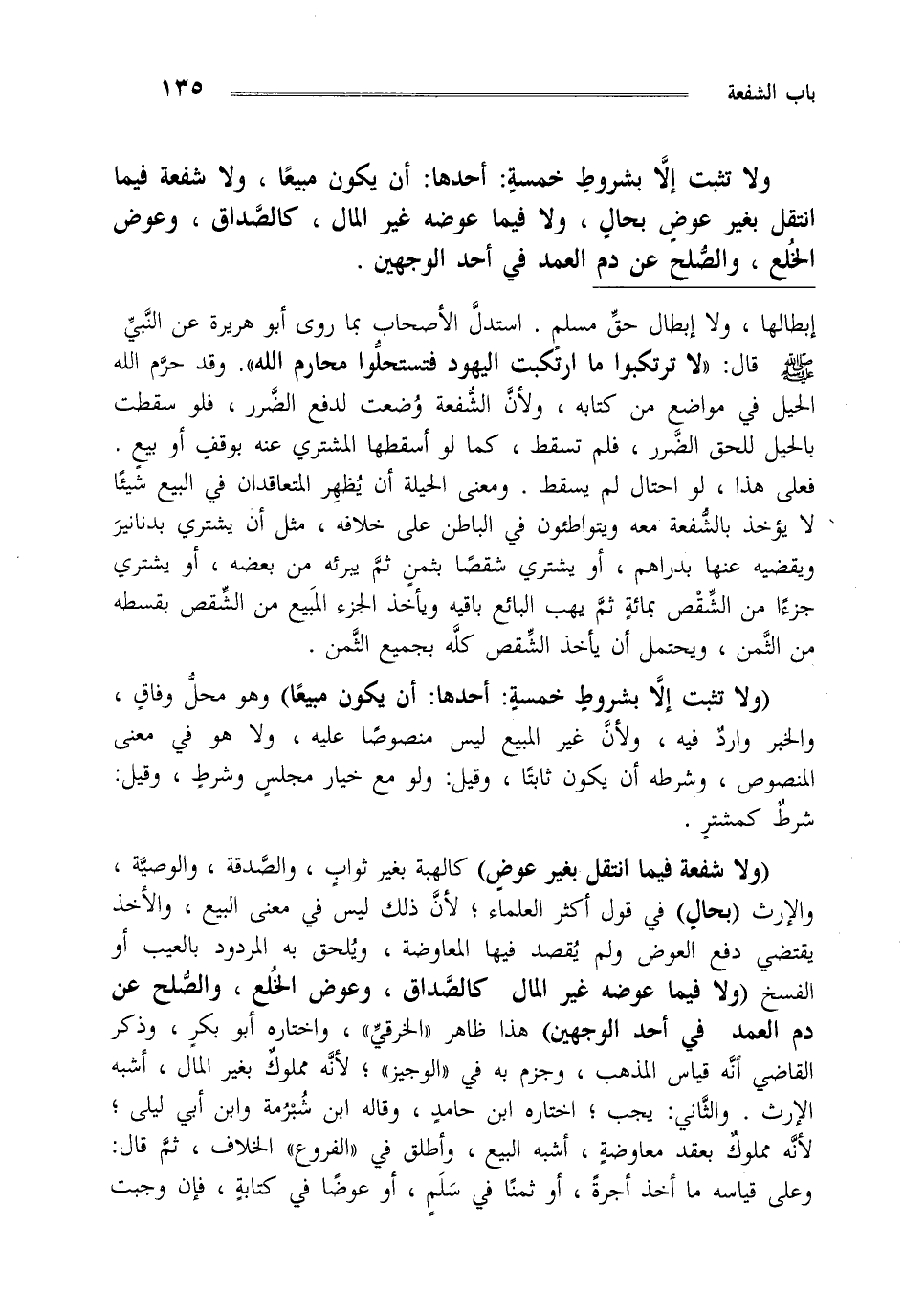 "ولا شفعة فيما انتقل بغير عوض" كالهبة بغير ثواب والصدقة والوصية والإرث"بحال" في قول أكثر العلماء لأن ذلك ليس في معنى البيع والأخذ يقتضي دفع العوض ولم يقصد فيها المعاوضة ويلحق به المردود بالعيب أو الفسح "ولا فيما عوضه غيرالمال كالصداق وعوض الخلع والصلح عن دم العمد في أحد الوجهين" هذا ظاهر الخرقي واختاره أبو بكر وذكر القاضي أنه قياس المذهب وجزم به في الوجيز لأنه مملوك بغير المال أشبه الإرث والثاني يجب اختاره ابن حامد وقاله ابن شبرمة وابن أبي ليلى لأنه مملوك بعقد معاوضة أشبه البيع وأطلق في الفروع الخلاف ثم قال وعلى قياسه ما أخذ أجرة أو ثمنا في سلم أو عوضا في كتابة فإن وجبت