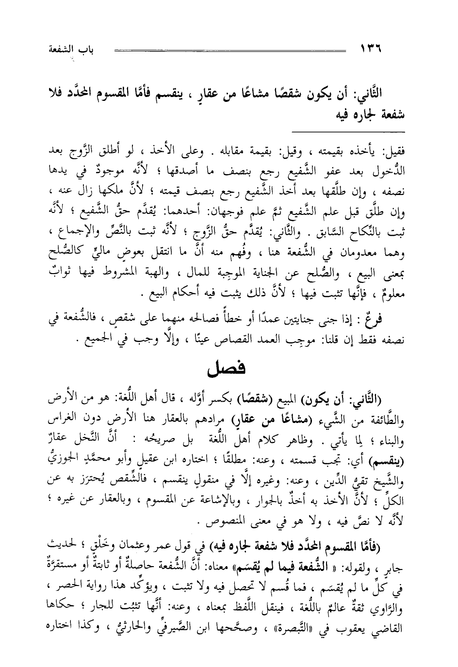 "الثاني أن يكون" المبيع "شقصا" بكسر أوله قال أهل اللغة هو من الأرض والطائفة من الشيء "مشاعا من عقار" مرادهم بالعقار هنا الأرض دون الغراس والبناء لما يأتي وظاهر كلام أهل اللغة بل صريحه أن النخل عقار "ينقسم" أي تجب قسمته وعنه مطلقا اختاره ابن عقيل وأبو محمد الجوزي والشيخ تقي الدين وعنه وغيره إلا في منقول ينقسم فالشقص يحترز به عن الكل لأن الأخذ به أخذ بالجوار وبالإشاعة عن المقسوم وبالعقار عن غيره لأنه لا نص فيه ولا هو في معنى المنصوص.