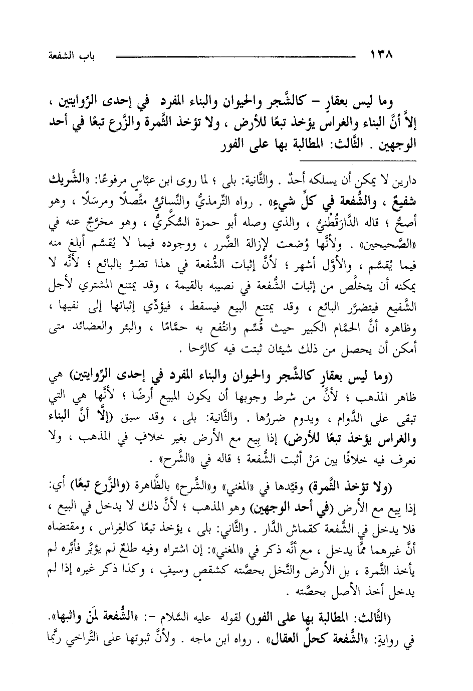 "وما ليس بعقار كالشجر والحيوان والبناء المفرد في إحدى الروايتين" هي ظاهر المذهب لأن من شرط وجوبها أن يكون المبيع أرضا لأنها هي التي تبقى على الدوام ويدوم ضررها والثانية بلى وقد سبق "إلا أن البناء والغراس يؤخذ تبعا للأرض" إذا بيع مع الأرض بغير خلاف في المذهب ولا نعرف فيه خلافا بين من أثبت الشفعة قاله في الشرح.