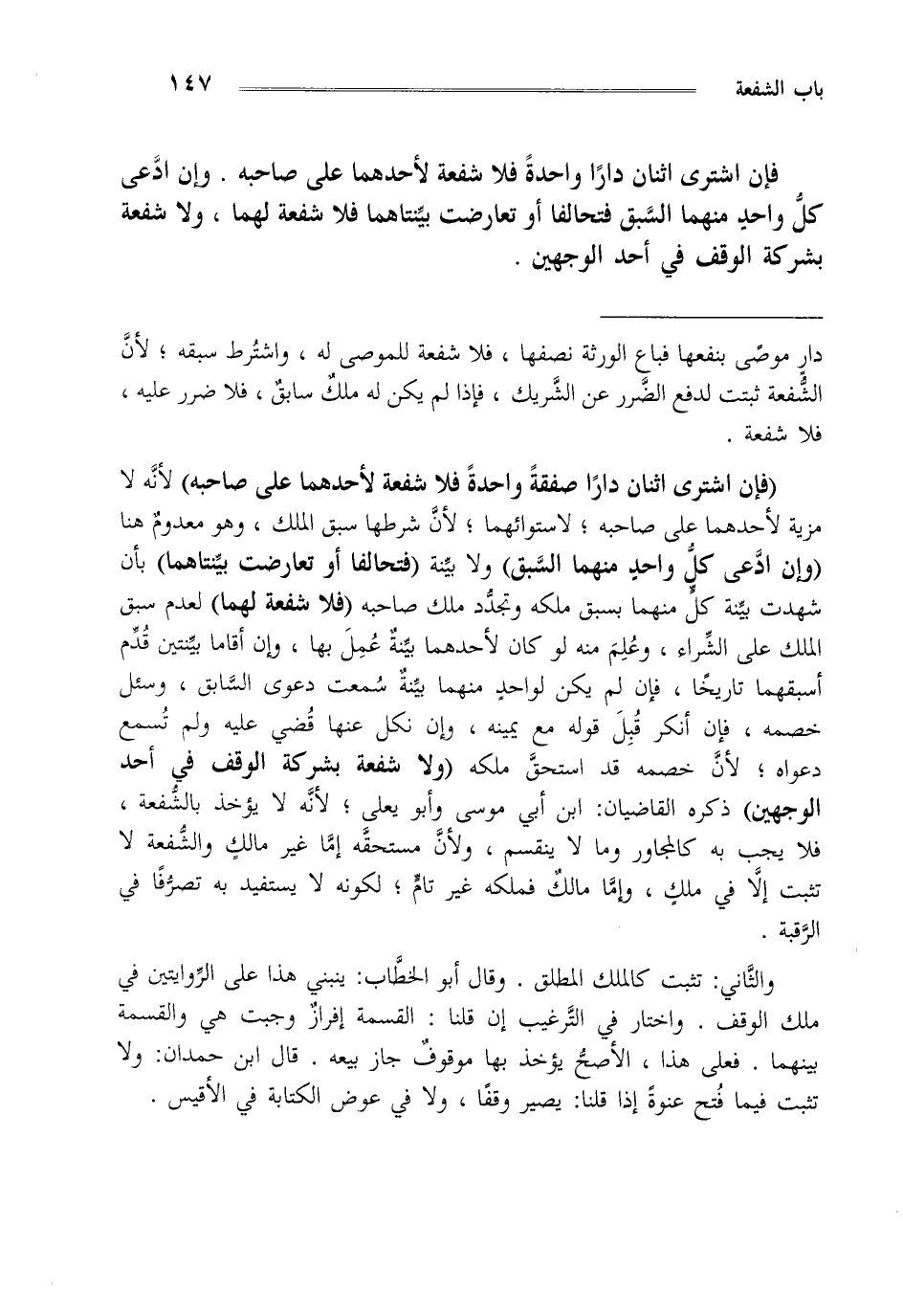"فإن اشترى اثنان داراصفقة واحدة فلا شفعة لاحدهما على صاحبه" لأنه لا مزية لأحدهما على صاحبه لاستوائهما لأن شرطها سبق الملك وهو معدوم هنا "وإن ادعى كل واحد منهما السبق" ولا بينة "فتحالفا أو تعارضت ينتاهما" بأن شهدت بينة كل منهما بسبق ملكه وتجدد ملك صاحبه "فلا شفعه لهما" لعدم سبق الملك على الشراء وعلم منه لو كان لأحدهما بينة عمل بها وإن أقاما بينتين قدم أسبقهما تاريخا فإن لم يكن لواحد منهما بينة سمعت دعوى السابق وسئل خصمه فإن انكر قبل قوله مع يمينه وإن نكل عنها قضي عليه ولم تسمع دعواه لأن خصمه قد استحق ملكه "ولا شفعة بشركة الوقف في أحد الوجهين" ذكره القاضيان ابن أبي موسى وأبو يعلى لأنه لا يؤخذ بالشفعة فلا يجب به كالمجاور وما لا ينقسم ولأن مستحقه إما غيرمالك والشفعة لا تثبت إلا في ملك وإما مالك فملكه غيرتام لكونه لا يستفيد به تصرفا في الرقبة