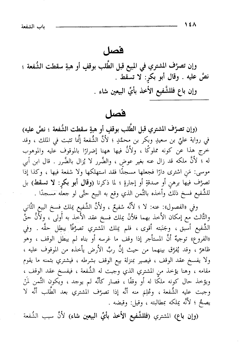 "وإن تصرف المشتري قبل الطلب بوقف أو هبة سقطت الشفعة نص عليه" في رواية علي بن سعيد وبكر بن محمد لأن الشفعة إنما تثبت في الملك وقد خرج هذا عن كونه مملوكا ولأن فيها هاهنا إضرار بالموقوف عليه والموهوب له لان ملكه قد زال عنه بغير عوض والضرر لا يزال بالضرر قال ابن أبي موسى من اشترى دارا فجعلها مسجدا فقد استهلكها ولا شفعة فيها وكذا إذا تصرف فيها برهن أو صدقة أو إجارة لما ذكرنا "وقال أبو بكر لا تسقط" بل للشفيع فسخ ذلك وأخذه بالثمن الذي وقع به البيع حتى لو جعله مسجدا.