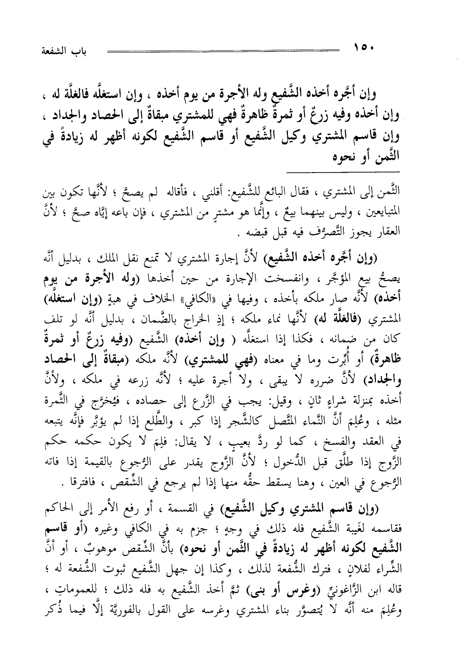 "وإن أجره أخذه الشفيع" لأن إجارة المشتري لا تمنع نقل الملك بدليل أنه يصح بيع المؤجر وانفسخت الإجارة من حين أخذها "وله الأجرة من يوم أخذه" لأنه صار ملكه بأخذه وفيها في الكافي الخلاف في هبة "وإن استغله" المشتري "فالغلة له" لأنها نماء ملكه إذ الخراج بالضمان بدليل أنه لو تلف كان من ضمانه فكذا إذا استغله "وإن أخذه" الشفيع "وفيه زرع أو ثمرة ظاهرة" أو أبرت وما في معناه "فهي للمشتري" لأنه ملكه "مبقاة إلى الحصاد والجداد" لأن ضرره لا يبقى ولا أجرة عليه لأنه زرعه في ملكه ولأن أخذه بمنزلة شراء ثان وقيل يجب في الزرع إلى حصاده فيخرج في الثمرة مثله وعلم أن النماء المتصل كالشجر إذا كبر والطلع إذا لم يؤبر فإنه يتبعه في العقد والفسخ كما لورد بعيب لا يقال فلم لا يكون حكمه حكم الزوج إذا طلق قبل الدخول لأن الزوج يقدر على الرجوع بالقيمة إذا فاته الرجوع في العين وهنا يسقط حقه منها إذا لم يرجع في الشقص فافترقا.