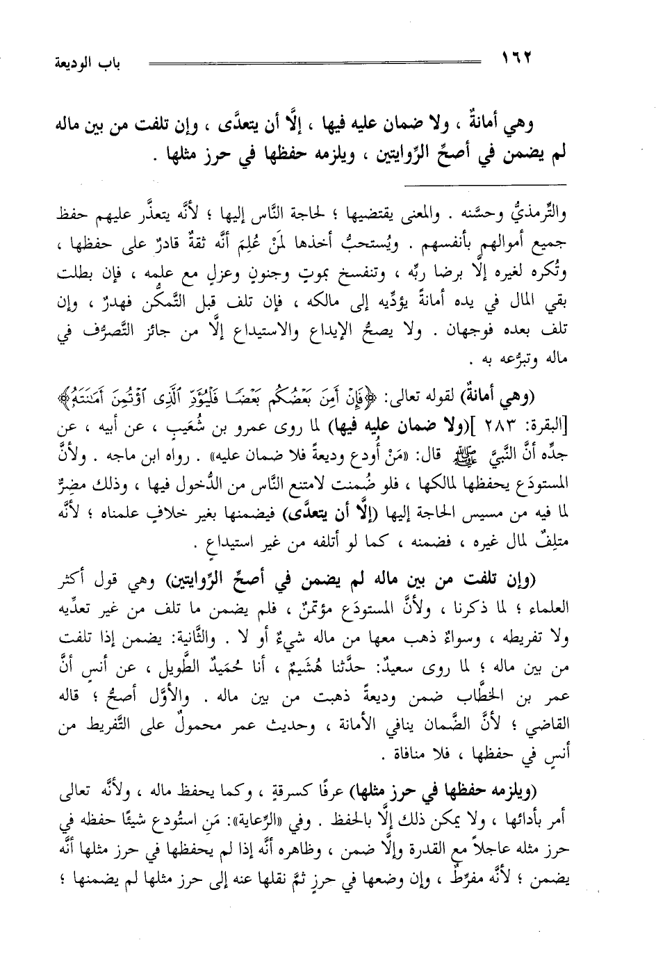 "وهي امانة" لقوله تعالى {فَإِنْ أَمِنَ بَعْضُكُمْ بَعْضاً فَلْيُؤَدِّ الَّذِي اؤْتُمِنَ أَمَانَتَهُ} (البقرة: من الآية283) "ولا ضمان عليه فيها" لما روى عمرو بن شعيب عن أبيه عن جده أن النبي صلى الله عليه وسلم قال "من أودع وديعة فلا ضمان عليه" رواه ابن ماجه ولأن المستودع يحفظها لمالكها فلو ضمنت لامتنع الناس من الدخول فيها وذلك مضر لما فيه من مسيس الحاجة إليها "إلا أن يتعدى" فيضمنها بغير خلاف علمناه لأنه متلف لمال غيره فضمنه كما لو أتلفه من غيراستيداع.