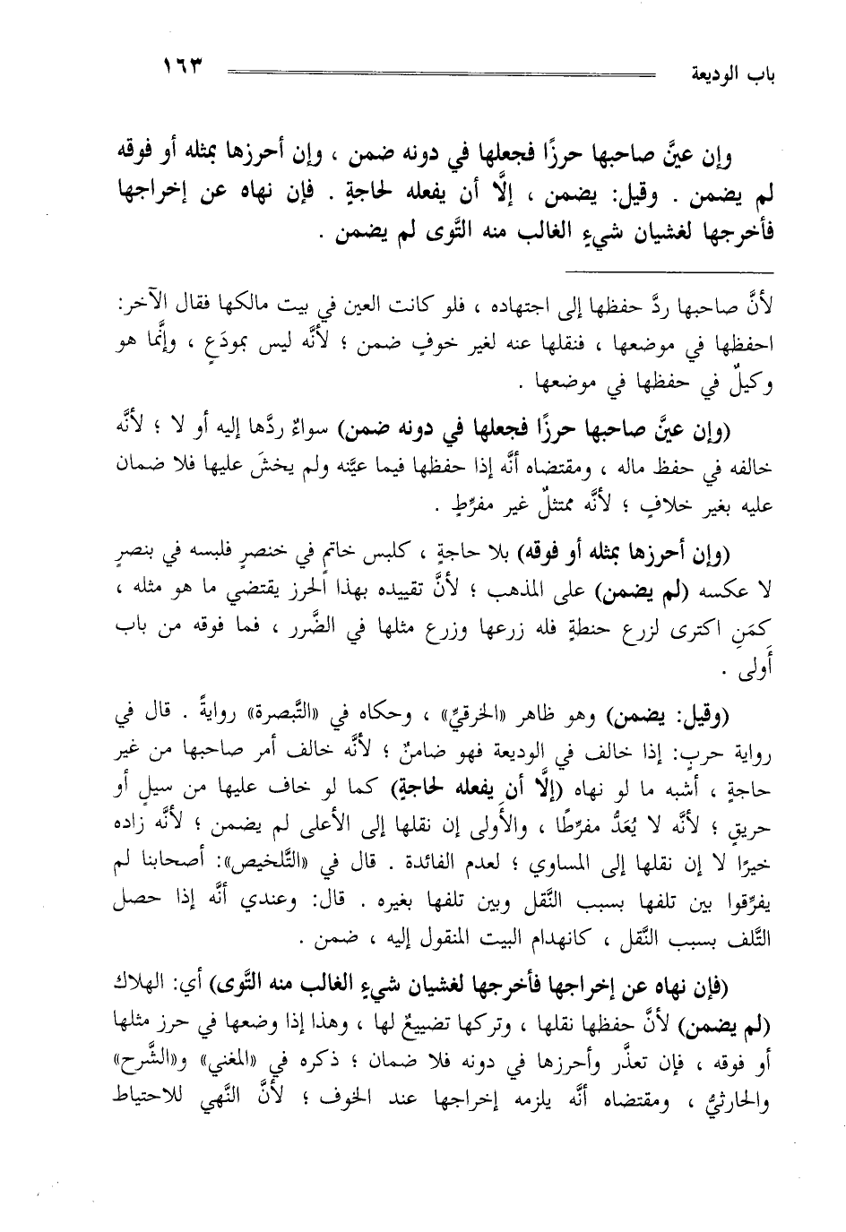 "وقيل يضمن" وهو ظاهر الخرقي وحكاه في التبصرة رواية قال في رواية حرب إذا خالف في الوديعة فهو ضامن لأنه خالف أمر صاحبها من غيرحاجة أشبه ما لو نهاه "إلا أن يفعله لحاجة" كما لو خاف عليها من سيل أو حريق لأنه لا يعد مفرطا والأولى إن نقلها إلى الأعلى لم يضمن لأنه زاده خيرا لا إن نقلها إلى المساوي لعدم الفائدة قال في التلخيص أصحابنا لم يفرقوا بين تلفها بسبب النقل وبين تلفها بغيره قال وعندي أنه إذا حصل التلف بسبب النقل كانهدام البيت المنقول إليه ضمن