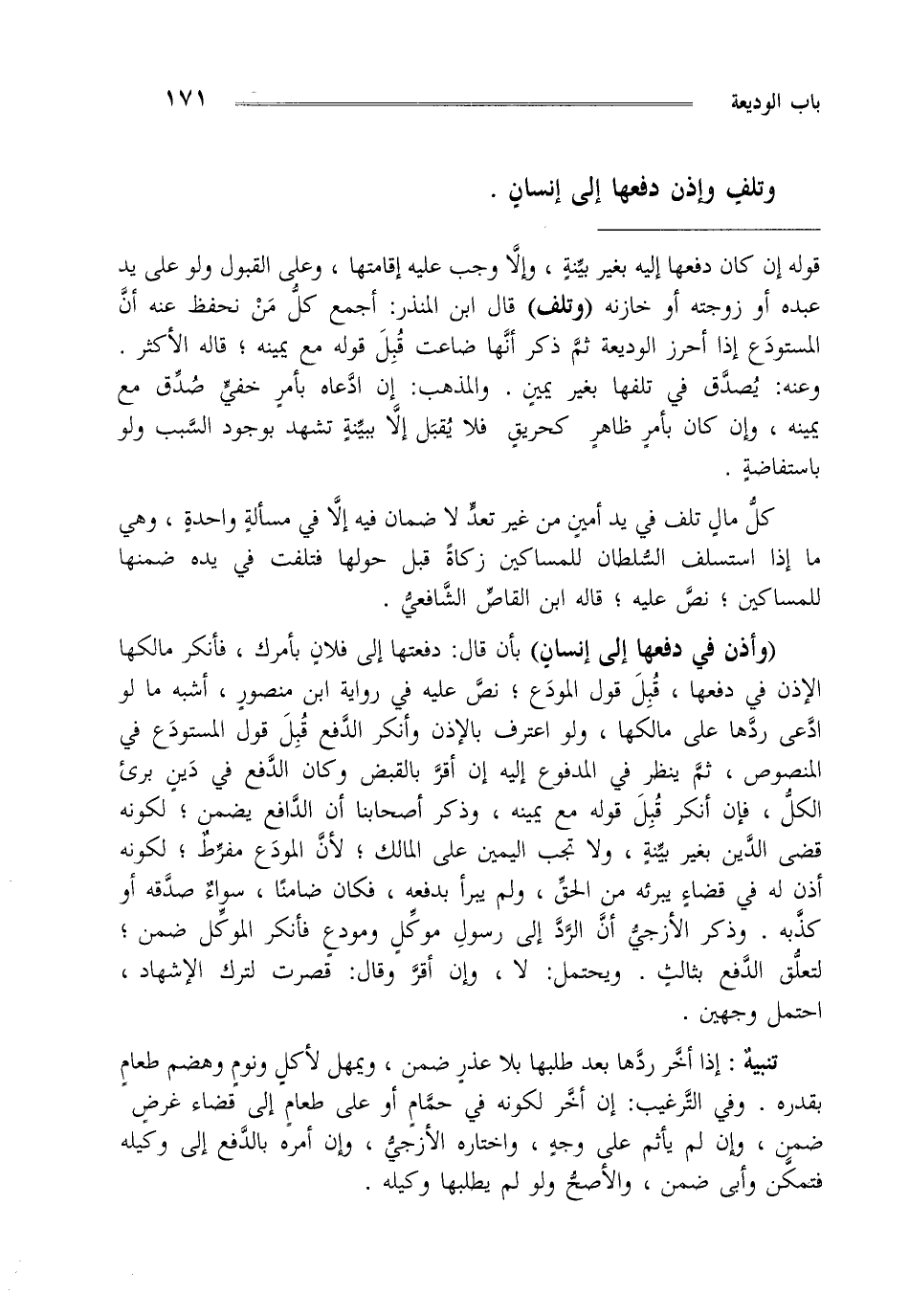 تنبيه: إذا أخر ردها بعد طلبها بلا عذر ضمن ويمهل لأكل ونوم وهضم طعام بقدره وفي الترغيب إن أخر لكونه في البغوي أو على طعام إلى قضاء غرض ضمن وإن لم كالذي على وجه واختاره الازجي وإن أمره بالدفع إلى وكيله فتمكن وأبي ضمن والأصح ولو لم يطلبها وكيله