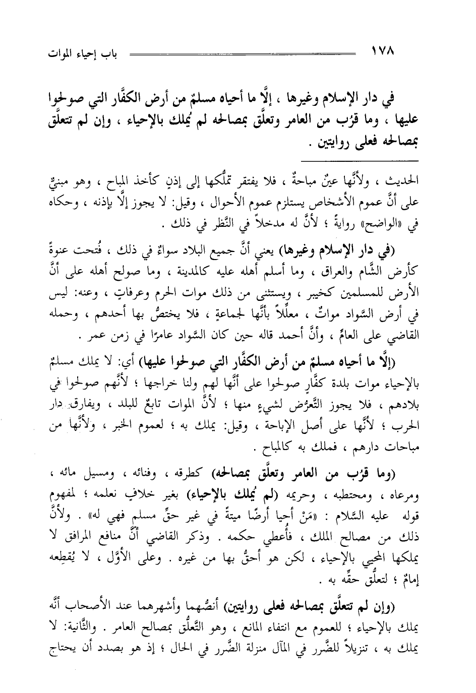 في دار الإسلام وغيرها إلا ما أحياه مسلم من أرض الكفار التي صولحوا عليها وما قرب من العامر وتعلق بمصالحه لم يملك بالإحياء وإن لم تتعلق بمصالحه فعلى روايتين