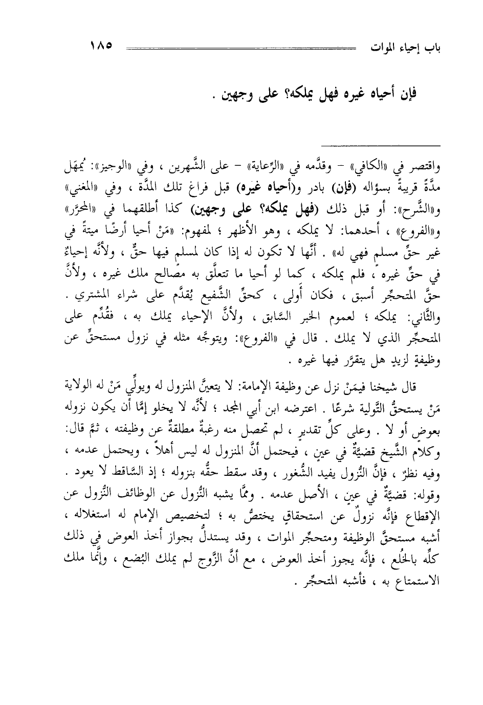 واقتصر في الكافي وقدمه في الرعاية على الشهرين وفي الوجيز يمهل مدة قريبة بسؤاله "فإن" بادر "وأحياه غيره" قبل فراغ تلك المدة وفي المغني والشرح أو قبل ذلك "فهل يملكه على وجهين" كذا أطلقهما في المحرر والفروع أحدهما لا يمكله وهو الأظهر لمفهوم "من أحيا أرضا ميتة في غير حق مسلم فهي له" إنها لا تكون له إذا كان لمسلم فيها حق ولأنه إحياء في حق غيره فلم يملكه كما لو أحيا ما يتعلق به مصالح ملك غيره ولأن حق المتحجر أسبق فكان أولى كحق الشفيع يقدم على شراء المشتري والثاني يملكه لعموم الخبر السابق ولأن الإحياء يملك به فقدم على المتحجر الذي لا يملك قال في الفروع ويتوجه مثله في نزول مستحق عن وظيفة لزيد هل يتقرر فيها غيره