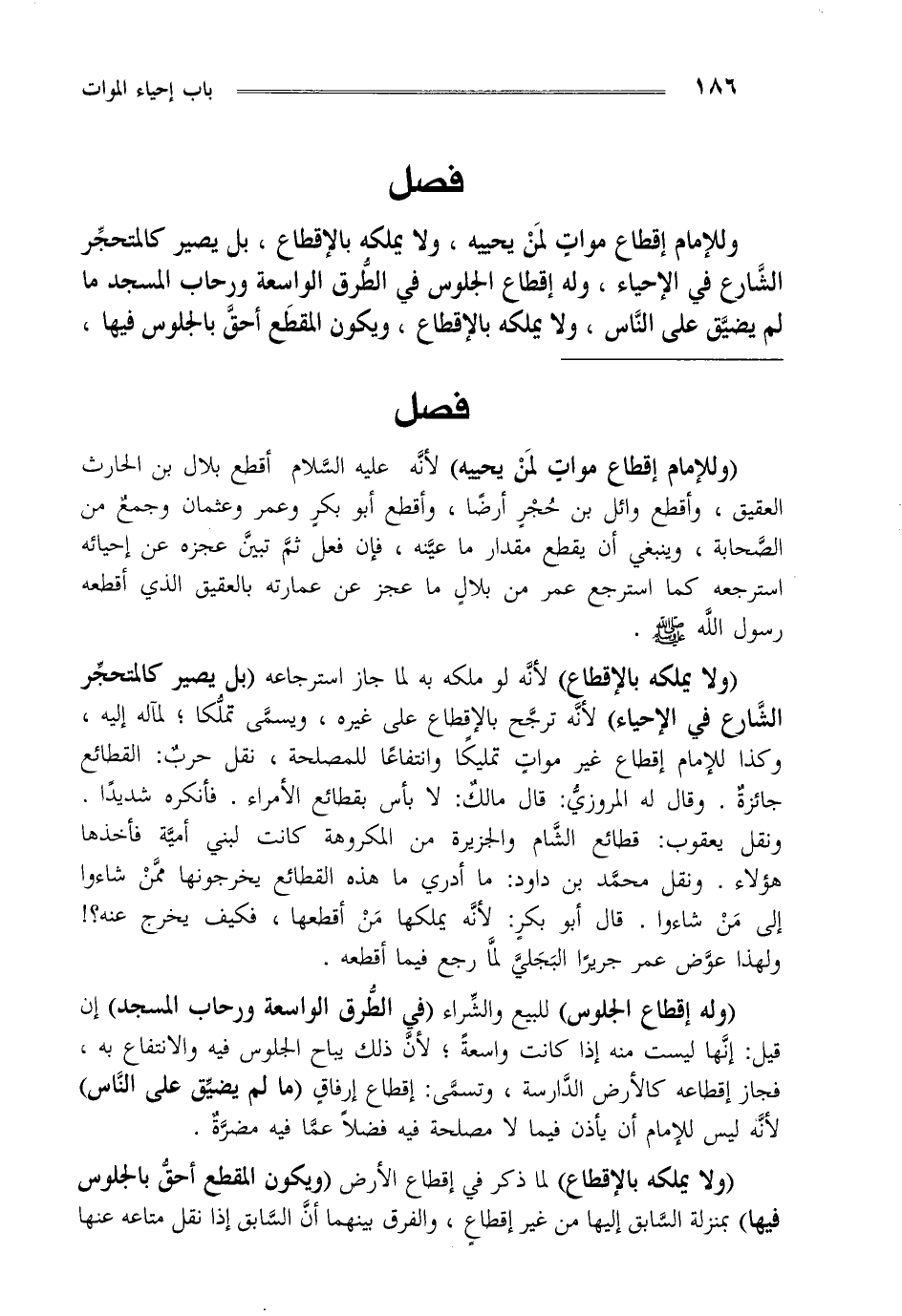 "ولا يملكه بالإقطاع" لأنه لو ملكه به لما جاز استرجاعه "بل يصير كالمحتجر الشارع في الإحياء" لأنه ترجح بالإقطاع على غيره ويسمى تملكا لمآله إليه وكذا للإمام إقطاع غيرموات تمليكا وانتفاعا للمصلحة نقل حرب القطائع جائزة وقال له المروذي قال مالك لا بأس بقطائع الأمراء فانكره شديدا ونقل يعقوب قطائع الشام والجزيرة من المكرومه كانت لبني أمية فاخذها هؤلاء ونقل محمد بن داود ما أدري ما هذه القطائع يخرجونها ممن شاؤوا الى من شاؤوا قال أبو بكر لأنه يملكها من أقطعها فكيف يخرج عنه ولهذا عوض عمر جريرا البجلى لما رجع فيما اقطعه.