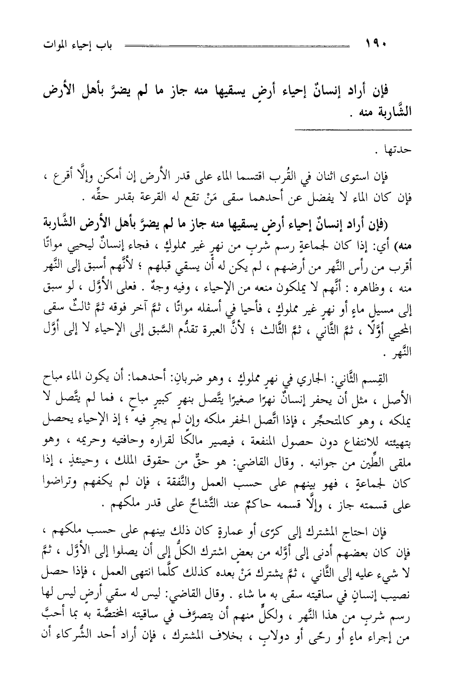 فإن احتاج المشترك إلى كري أو عمارة كان ذلك بينهم على حسب ملكهم فإن كان بعضهم أدنى إلى أوله من بعض اشترك الكل إلى أن يصلوا إلى الاول ثم لا شيء عليه إلى الثاني ثم يشترك من بعده كذلك كلما انتهى العمل فإذا حصل نصيب إنسان في ساقيته سقى به ماشاء وقال القاضي ليس له سقي أرض ليس لها رسم شرب من هذا النهر ولكل منهم أن يتصرف في ساقيته المختصة به بما أحب من إجراء ماء أو رحى أو دولاب بخلاف المشترك فإن أراد أحد الشركاء أن