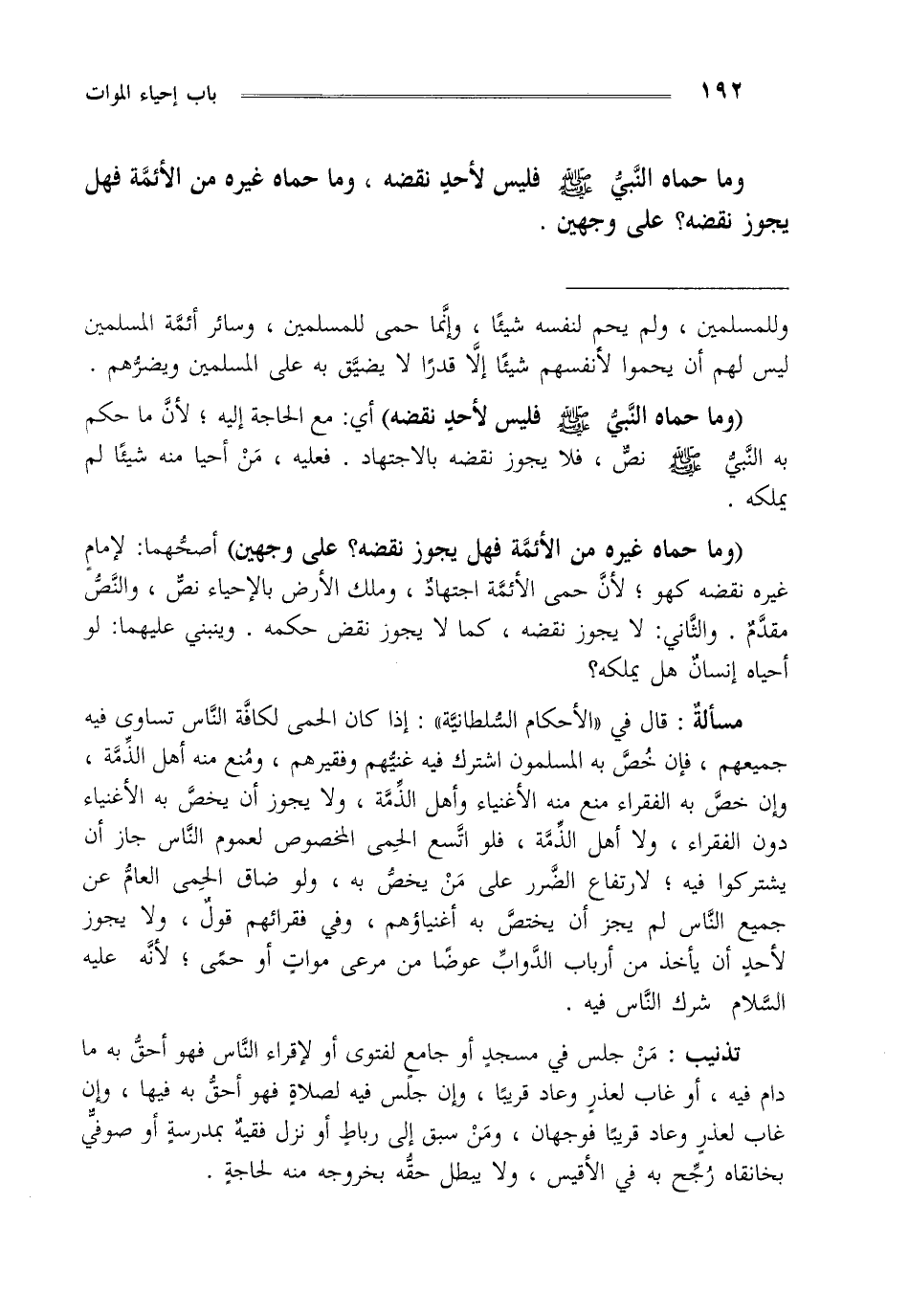 "ما حماه النبي صلى الله عليه وسلم فليس لأحد نقضه" أي مع الحاجة إليه لأن ما حكم به النبي صلى الله عليه وسلم نص فلا يجوز نقضه بالإجتهاد فعليه من أحيا منه شيئا لم يملكه.