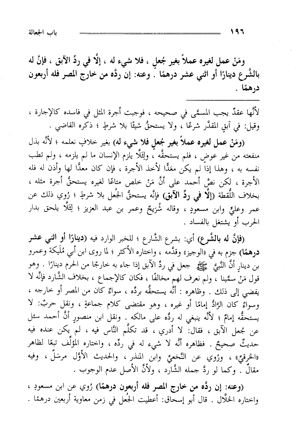 "وعنه إن رده من خارج المصر فله أربعون درهما" روي عن ابن مسعود واختاره الخلال قال أبو اسحاق أعطيت الجعل في زمن معاوية أربعين درهما